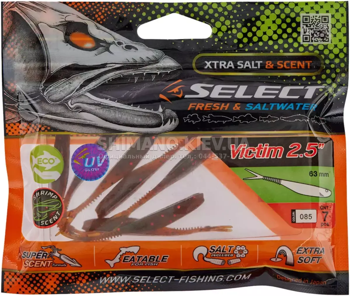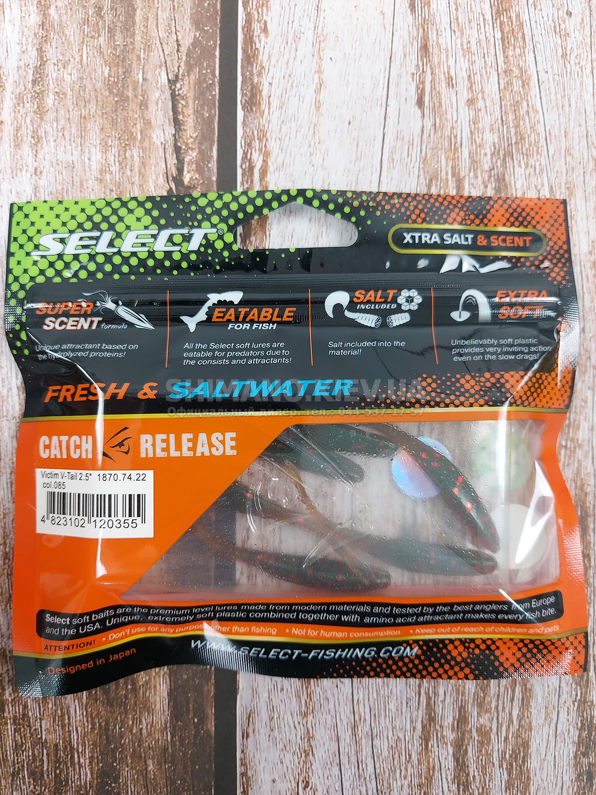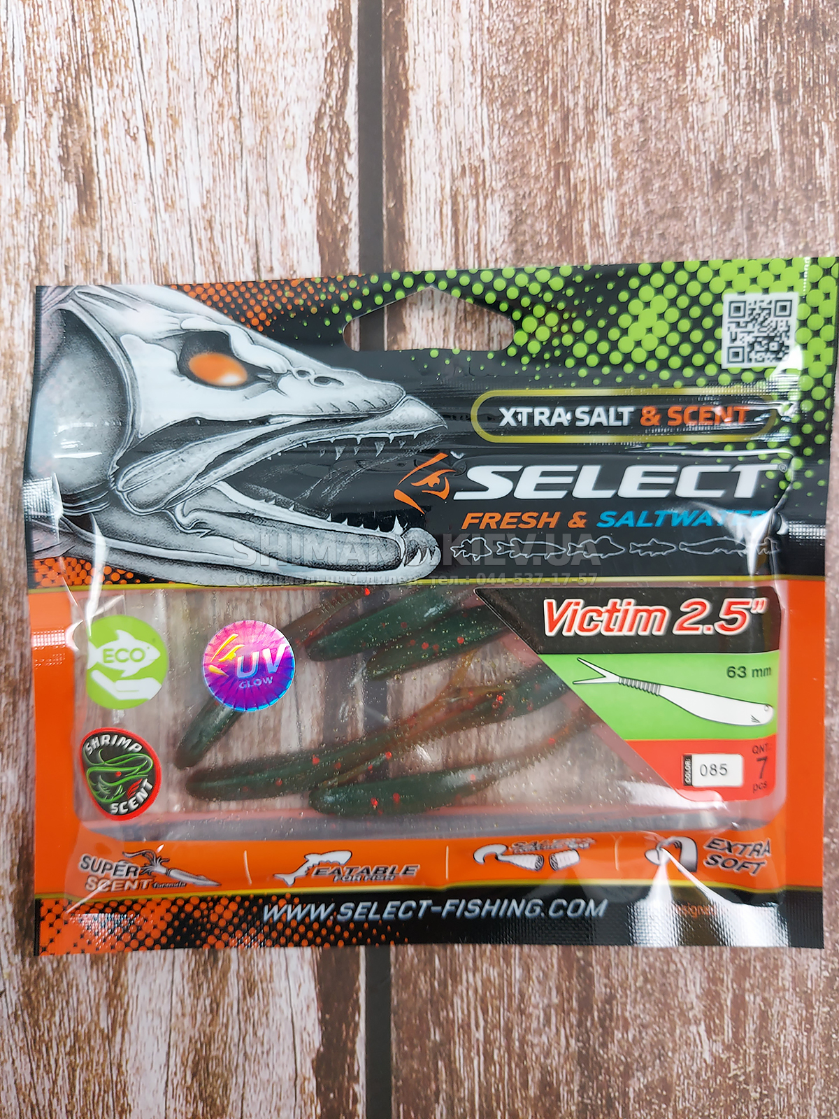 Силікон Select Victim V-Tail являє собою класичний слаг з V-подібним хвостом. Ребристе стерно хвоста сприяє збільшенню його міцності без шкоди рухливості. Приманка може оснащуватися на багато видів монтажів та різні типи гачків. Силікон ефективно працює при використанні, джигової техніки, дроп-шоту та повідцевого оснащення. Для підвищення ефективності ступінчастої проводки рекомендується у паузах виконувати похитування вершиною вудлища, що особливо провокує пасивну рибу. Додані до складу матеріалу сіль та атрактант збільшують привабливість приманки, оскільки вона залишає ароматний шлейф у воді та при обережному клюванні риба, відчуваючи їстівний смак, більш охоче захоплює слаг. Лінійка Victim V-Tail включає кілька розмірів від невеликих 2.5 дюймових до досить великих довжиною 6 дюймів. Така різноманітність дозволяє підібрати оптимальний варіант під певні види риби, а широка гама цікавих забарвлень ще більше підвищує ефективність у певних умовах на риболовлі.