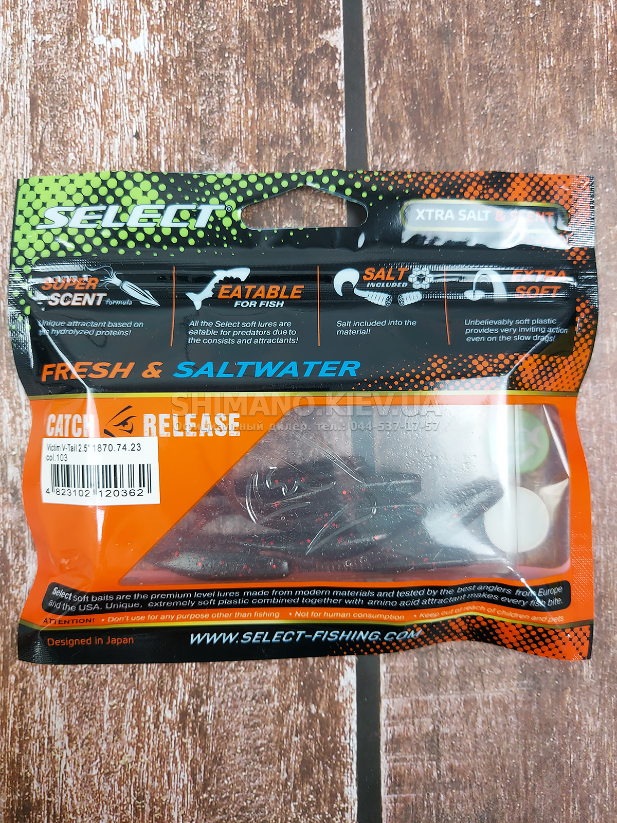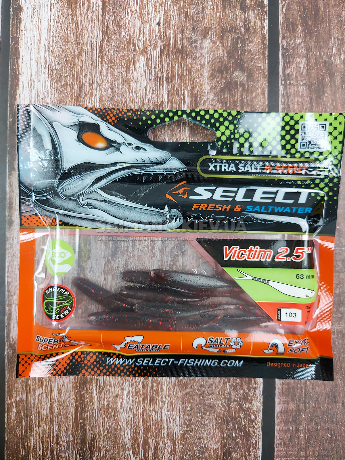 Силікон Select Victim V-Tail являє собою класичний слаг з V-подібним хвостом. Ребристе стерно хвоста сприяє збільшенню його міцності без шкоди рухливості. Приманка може оснащуватися на багато видів монтажів та різні типи гачків. Силікон ефективно працює при використанні, джигової техніки, дроп-шоту та повідцевого оснащення. Для підвищення ефективності ступінчастої проводки рекомендується у паузах виконувати похитування вершиною вудлища, що особливо провокує пасивну рибу. Додані до складу матеріалу сіль та атрактант збільшують привабливість приманки, оскільки вона залишає ароматний шлейф у воді та при обережному клюванні риба, відчуваючи їстівний смак, більш охоче захоплює слаг. Лінійка Victim V-Tail включає кілька розмірів від невеликих 2.5 дюймових до досить великих довжиною 6 дюймів. Така різноманітність дозволяє підібрати оптимальний варіант під певні види риби, а широка гама цікавих забарвлень ще більше підвищує ефективність у певних умовах на риболовлі.