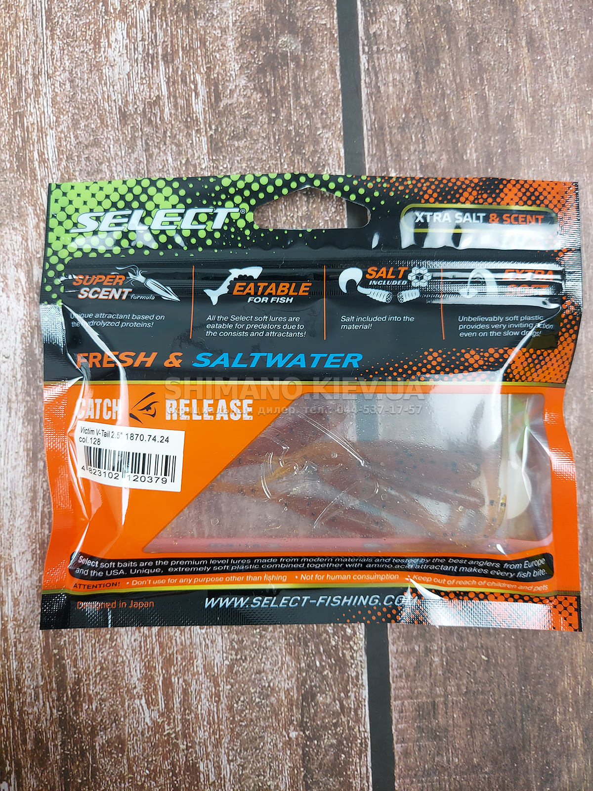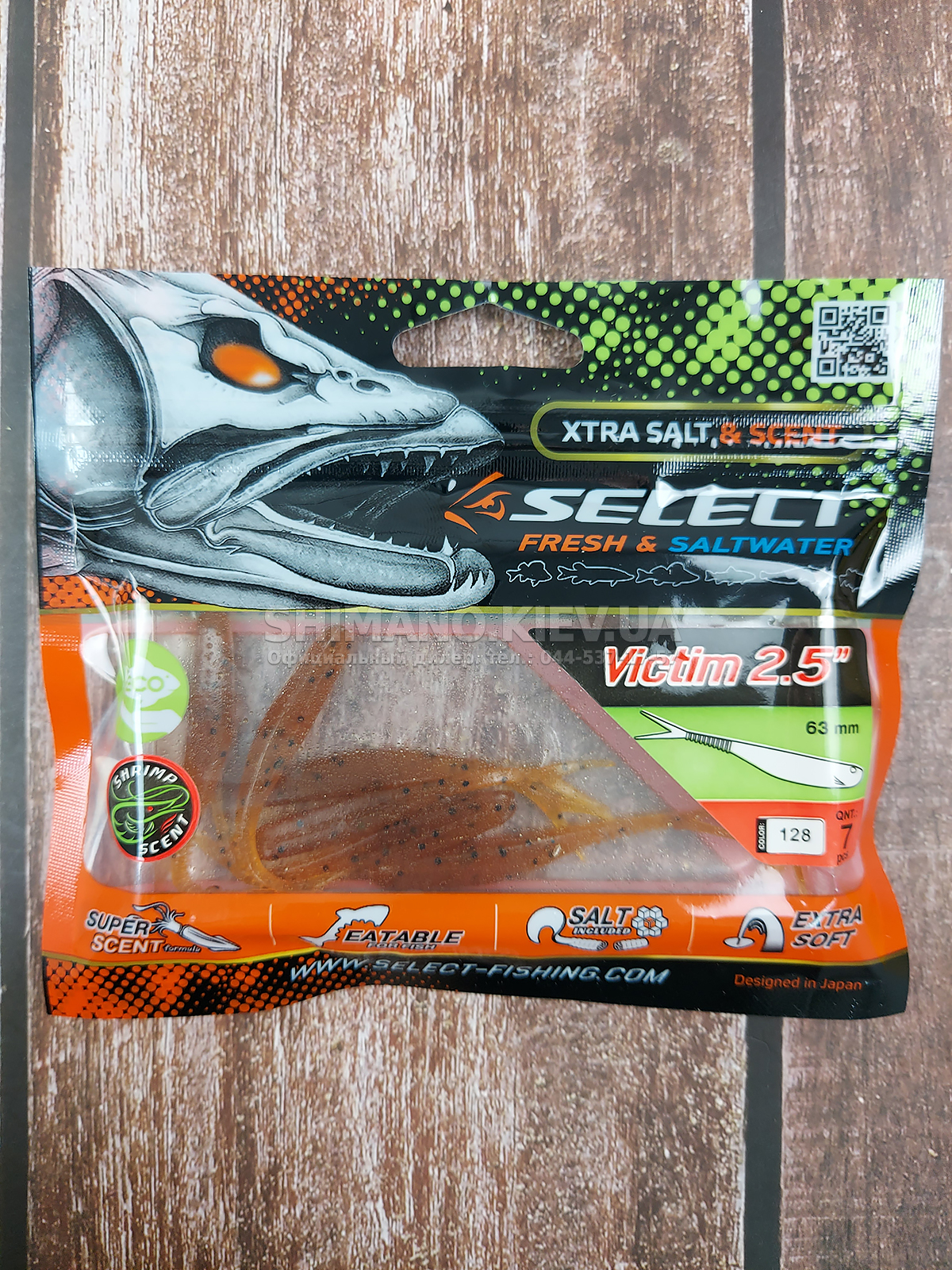 Силікон Select Victim V-Tail являє собою класичний слаг з V-подібним хвостом. Ребристе стерно хвоста сприяє збільшенню його міцності без шкоди рухливості. Приманка може оснащуватися на багато видів монтажів та різні типи гачків. Силікон ефективно працює при використанні, джигової техніки, дроп-шоту та повідцевого оснащення. Для підвищення ефективності ступінчастої проводки рекомендується у паузах виконувати похитування вершиною вудлища, що особливо провокує пасивну рибу. Додані до складу матеріалу сіль та атрактант збільшують привабливість приманки, оскільки вона залишає ароматний шлейф у воді та при обережному клюванні риба, відчуваючи їстівний смак, більш охоче захоплює слаг. Лінійка Victim V-Tail включає кілька розмірів від невеликих 2.5 дюймових до досить великих довжиною 6 дюймів. Така різноманітність дозволяє підібрати оптимальний варіант під певні види риби, а широка гама цікавих забарвлень ще більше підвищує ефективність у певних умовах на риболовлі.