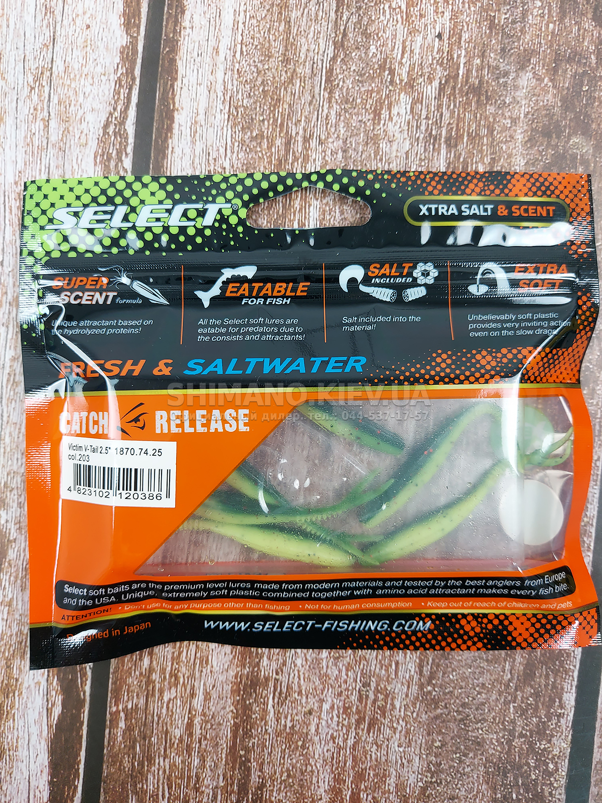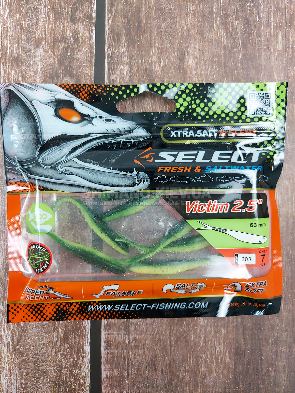 Силікон Select Victim V-Tail являє собою класичний слаг з V-подібним хвостом. Ребристе стерно хвоста сприяє збільшенню його міцності без шкоди рухливості. Приманка може оснащуватися на багато видів монтажів та різні типи гачків. Силікон ефективно працює при використанні, джигової техніки, дроп-шоту та повідцевого оснащення. Для підвищення ефективності ступінчастої проводки рекомендується у паузах виконувати похитування вершиною вудлища, що особливо провокує пасивну рибу. Додані до складу матеріалу сіль та атрактант збільшують привабливість приманки, оскільки вона залишає ароматний шлейф у воді та при обережному клюванні риба, відчуваючи їстівний смак, більш охоче захоплює слаг. Лінійка Victim V-Tail включає кілька розмірів від невеликих 2.5 дюймових до досить великих довжиною 6 дюймів. Така різноманітність дозволяє підібрати оптимальний варіант під певні види риби, а широка гама цікавих забарвлень ще більше підвищує ефективність у певних умовах на риболовлі.