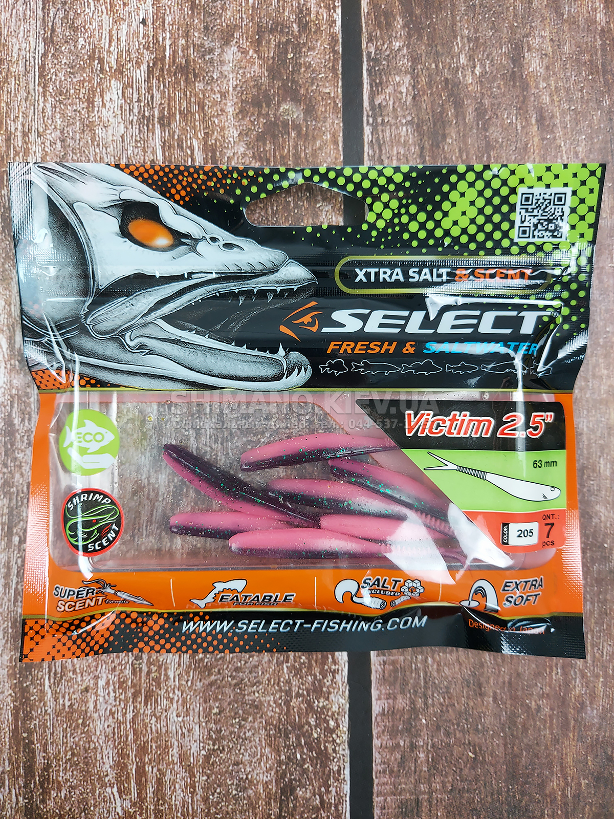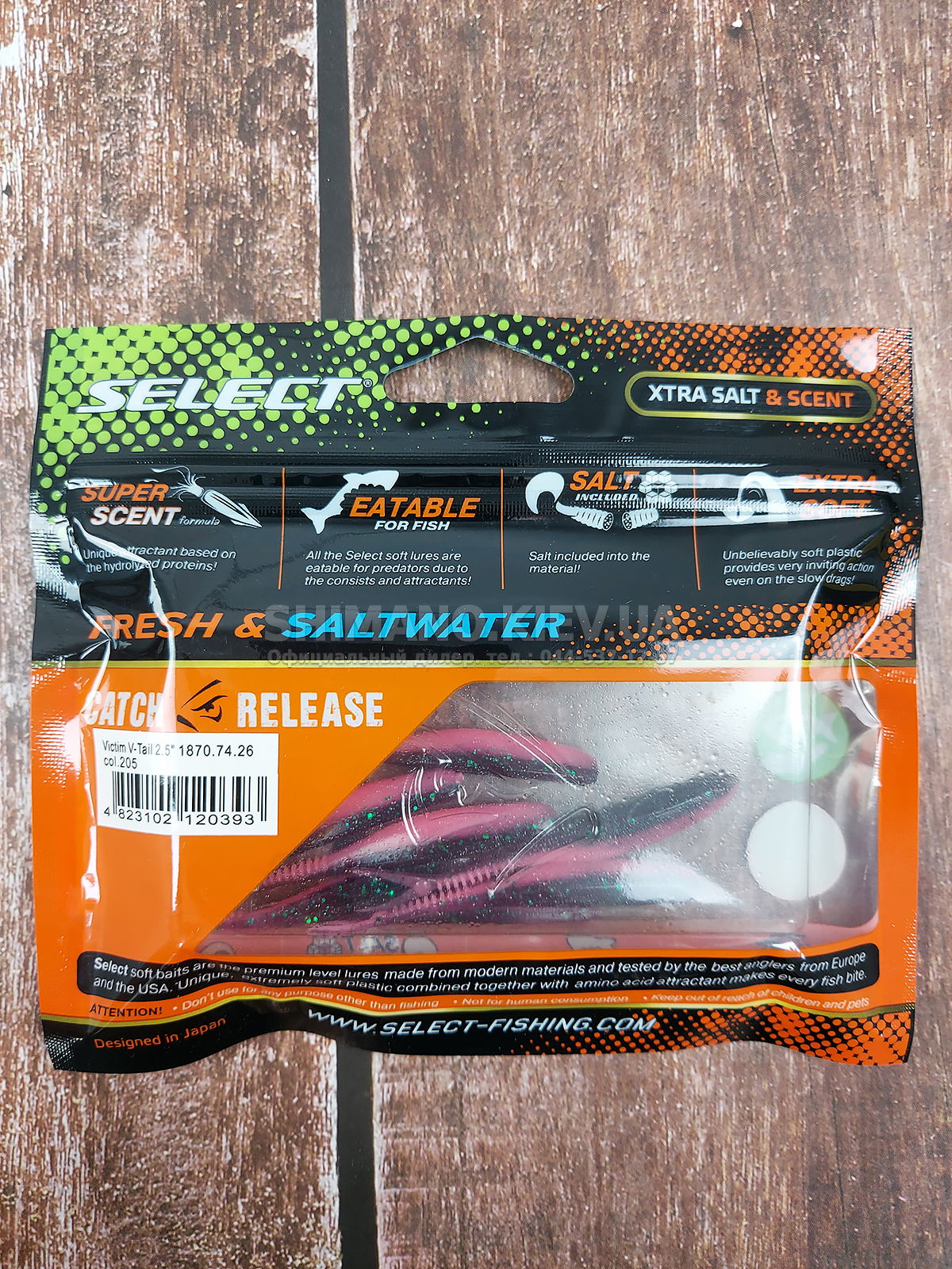 Силікон Select Victim V-Tail являє собою класичний слаг з V-подібним хвостом. Ребристе стерно хвоста сприяє збільшенню його міцності без шкоди рухливості. Приманка може оснащуватися на багато видів монтажів та різні типи гачків. Силікон ефективно працює при використанні, джигової техніки, дроп-шоту та повідцевого оснащення. Для підвищення ефективності ступінчастої проводки рекомендується у паузах виконувати похитування вершиною вудлища, що особливо провокує пасивну рибу. Додані до складу матеріалу сіль та атрактант збільшують привабливість приманки, оскільки вона залишає ароматний шлейф у воді та при обережному клюванні риба, відчуваючи їстівний смак, більш охоче захоплює слаг. Лінійка Victim V-Tail включає кілька розмірів від невеликих 2.5 дюймових до досить великих довжиною 6 дюймів. Така різноманітність дозволяє підібрати оптимальний варіант під певні види риби, а широка гама цікавих забарвлень ще більше підвищує ефективність у певних умовах на риболовлі.