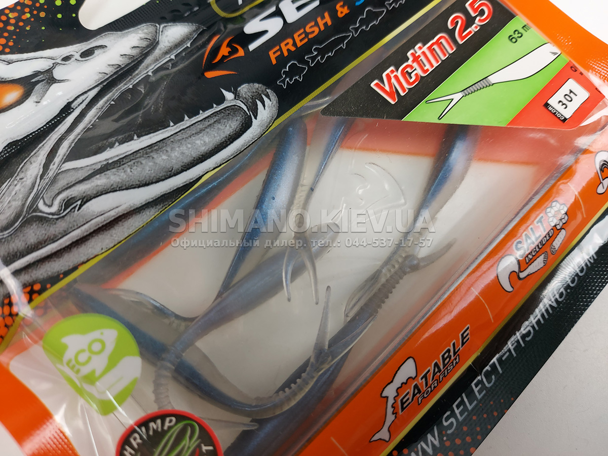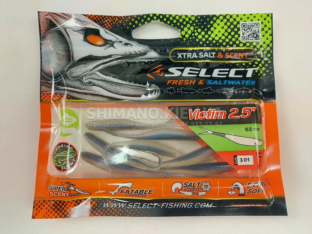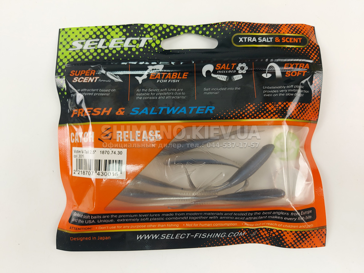 Силікон Select Victim V-Tail являє собою класичний слаг з V-подібним хвостом. Ребристе стерно хвоста сприяє збільшенню його міцності без шкоди рухливості. Приманка може оснащуватися на багато видів монтажів та різні типи гачків. Силікон ефективно працює при використанні, джигової техніки, дроп-шоту та повідцевого оснащення. Для підвищення ефективності ступінчастої проводки рекомендується у паузах виконувати похитування вершиною вудлища, що особливо провокує пасивну рибу. Додані до складу матеріалу сіль та атрактант збільшують привабливість приманки, оскільки вона залишає ароматний шлейф у воді та при обережному клюванні риба, відчуваючи їстівний смак, більш охоче захоплює слаг. Лінійка Victim V-Tail включає кілька розмірів від невеликих 2.5 дюймових до досить великих довжиною 6 дюймів. Така різноманітність дозволяє підібрати оптимальний варіант під певні види риби, а широка гама цікавих забарвлень ще більше підвищує ефективність у певних умовах на риболовлі.