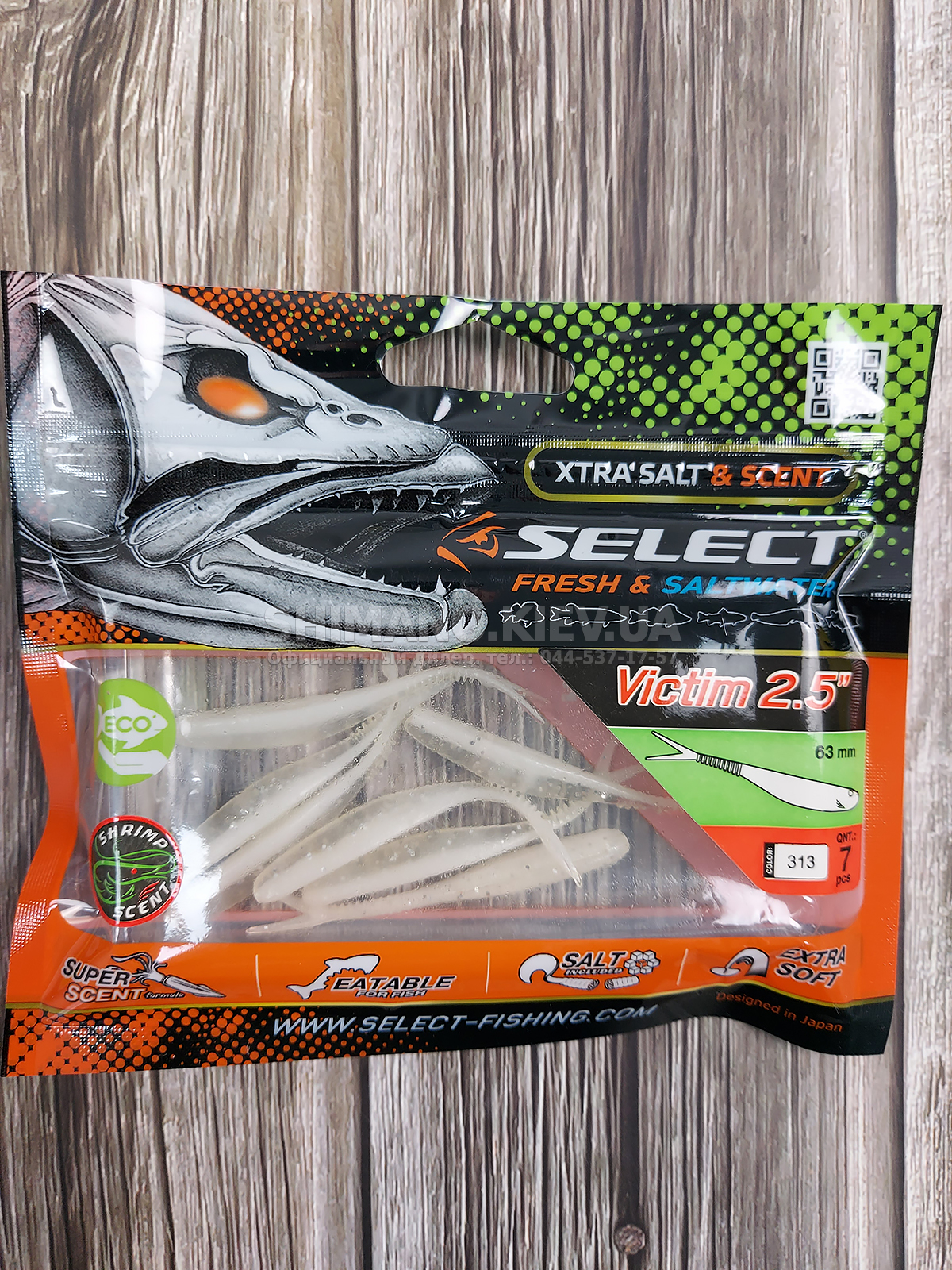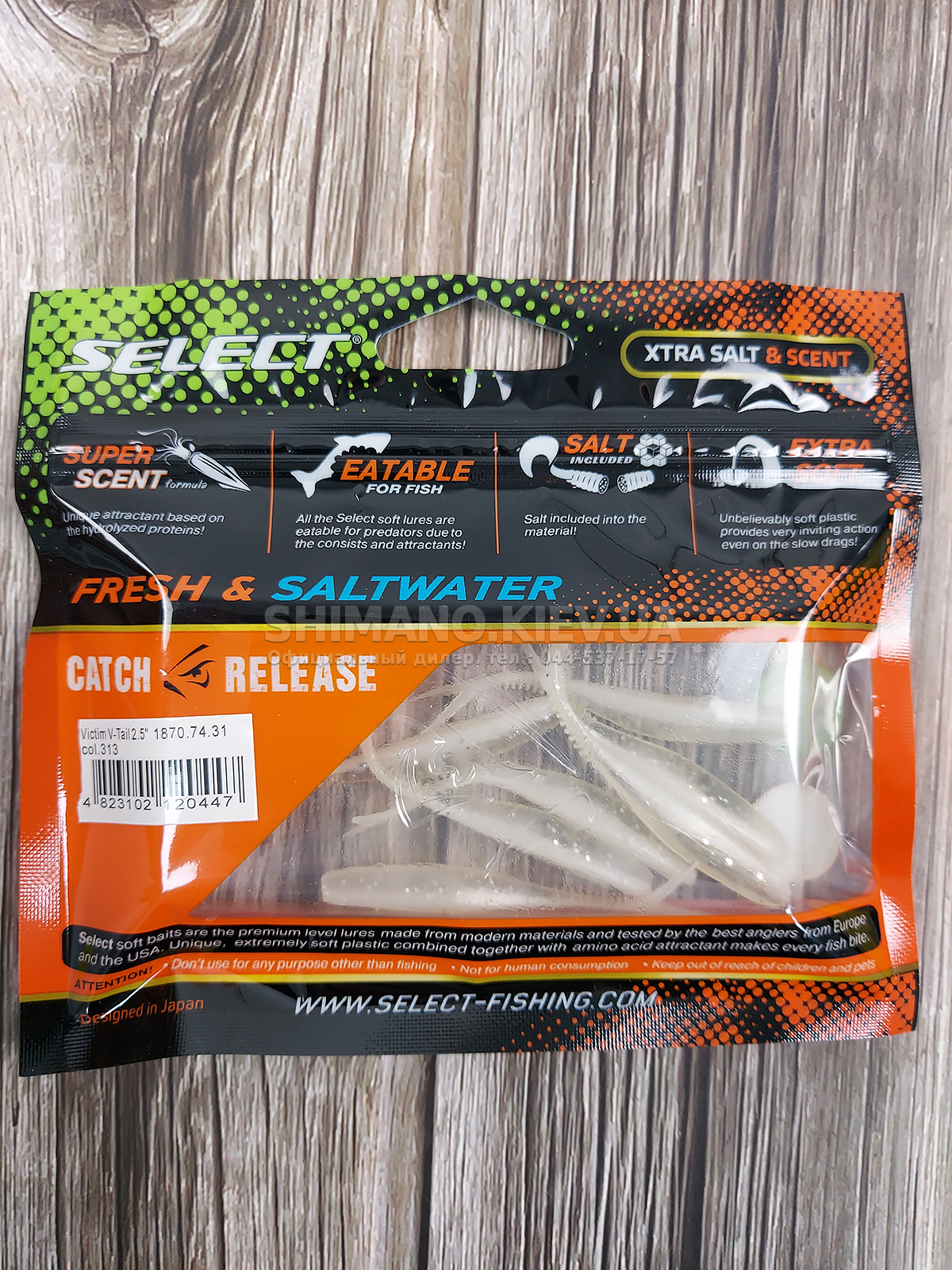 Силікон Select Victim V-Tail являє собою класичний слаг з V-подібним хвостом. Ребристе стерно хвоста сприяє збільшенню його міцності без шкоди рухливості. Приманка може оснащуватися на багато видів монтажів та різні типи гачків. Силікон ефективно працює при використанні, джигової техніки, дроп-шоту та повідцевого оснащення. Для підвищення ефективності ступінчастої проводки рекомендується у паузах виконувати похитування вершиною вудлища, що особливо провокує пасивну рибу. Додані до складу матеріалу сіль та атрактант збільшують привабливість приманки, оскільки вона залишає ароматний шлейф у воді та при обережному клюванні риба, відчуваючи їстівний смак, більш охоче захоплює слаг. Лінійка Victim V-Tail включає кілька розмірів від невеликих 2.5 дюймових до досить великих довжиною 6 дюймів. Така різноманітність дозволяє підібрати оптимальний варіант під певні види риби, а широка гама цікавих забарвлень ще більше підвищує ефективність у певних умовах на риболовлі.
