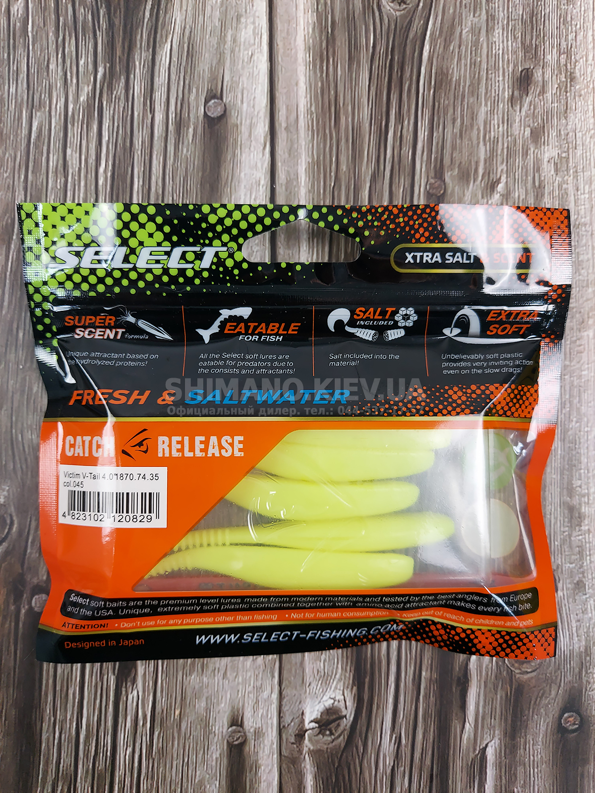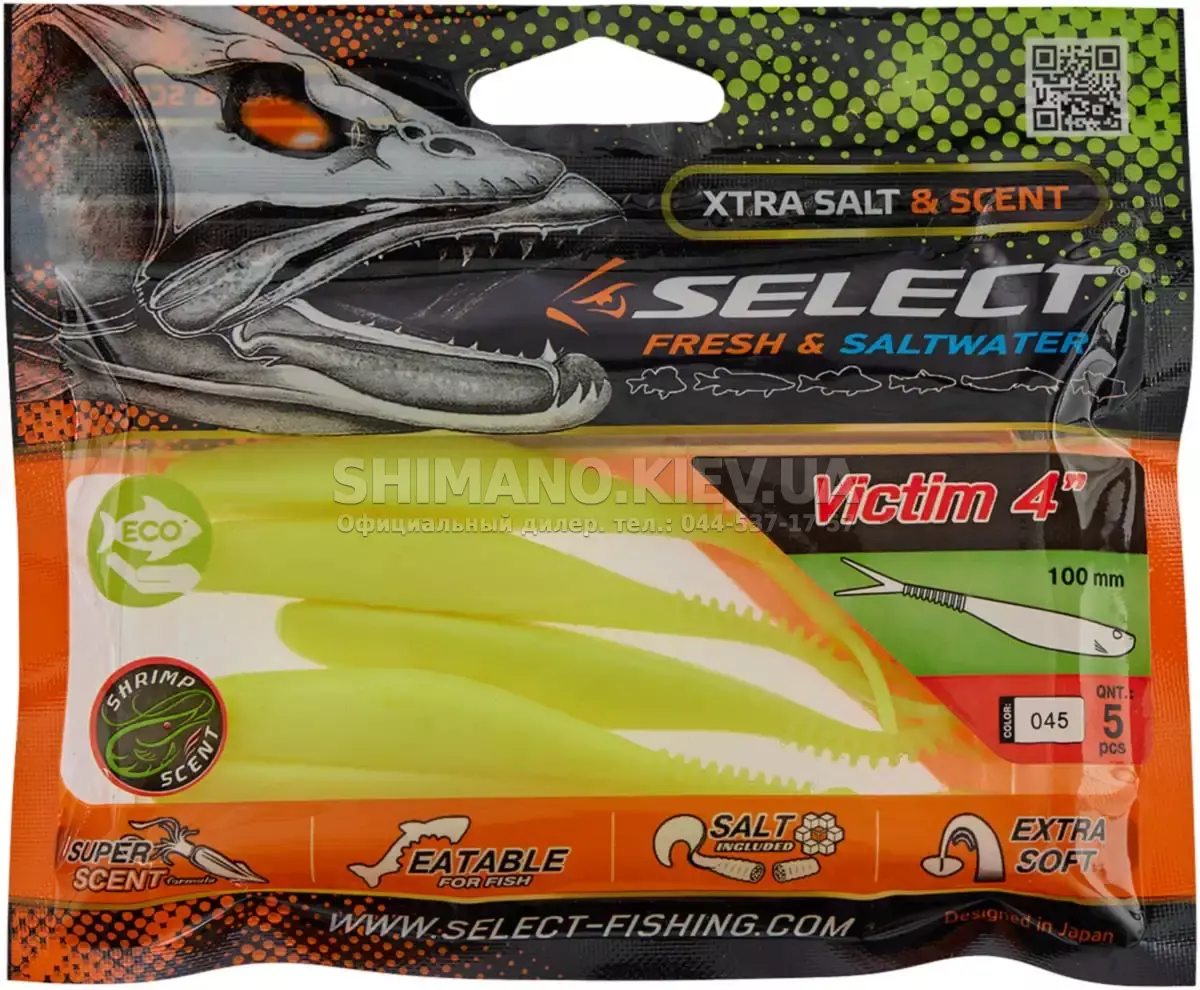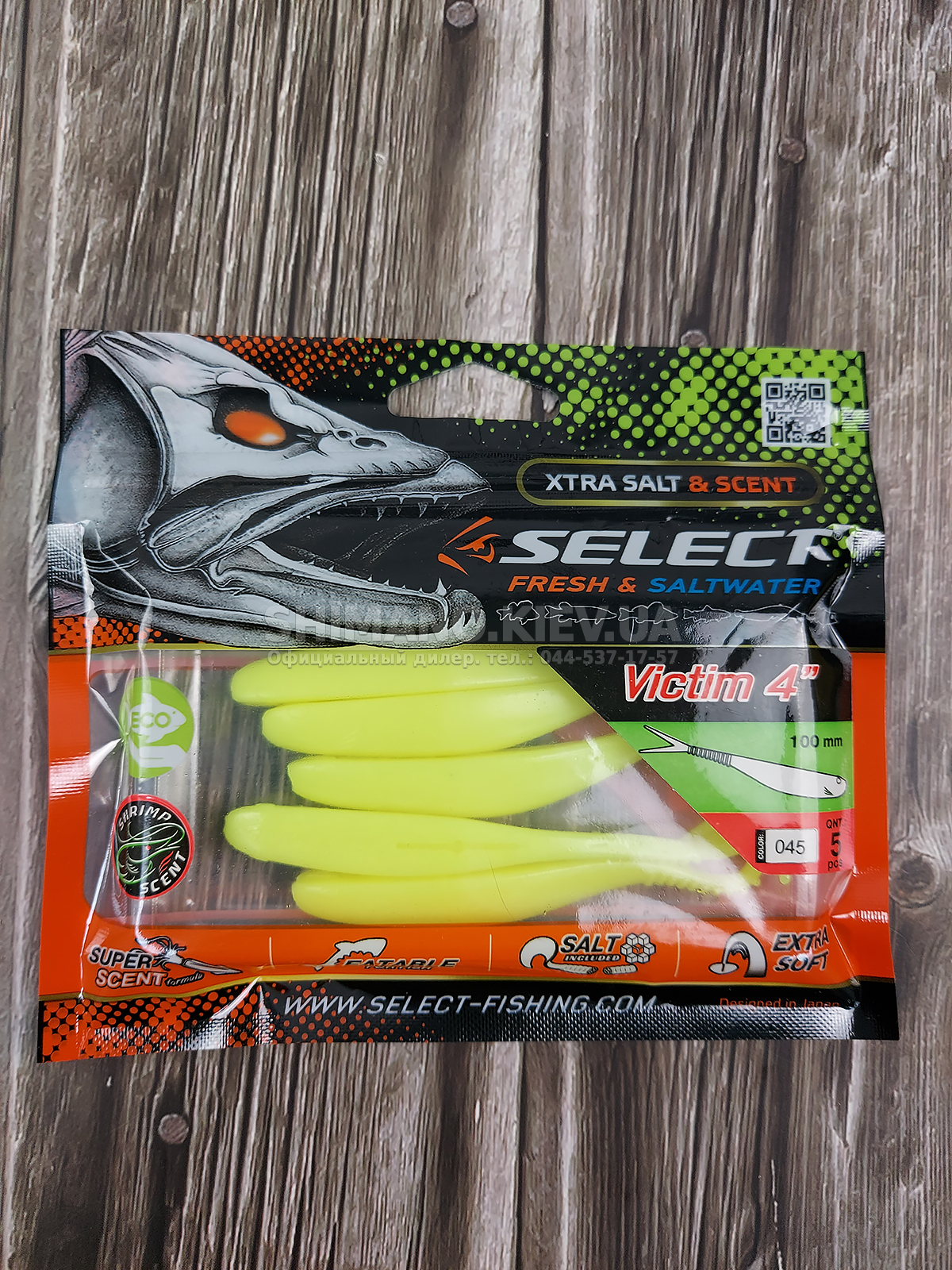 Силікон Select Victim V-Tail являє собою класичний слаг з V-подібним хвостом. Ребристе стерно хвоста сприяє збільшенню його міцності без шкоди рухливості. Приманка може оснащуватися на багато видів монтажів та різні типи гачків. Силікон ефективно працює при використанні, джигової техніки, дроп-шоту та повідцевого оснащення. Для підвищення ефективності ступінчастої проводки рекомендується у паузах виконувати похитування вершиною вудлища, що особливо провокує пасивну рибу. Додані до складу матеріалу сіль та атрактант збільшують привабливість приманки, оскільки вона залишає ароматний шлейф у воді та при обережному клюванні риба, відчуваючи їстівний смак, більш охоче захоплює слаг. Лінійка Victim V-Tail включає кілька розмірів від невеликих 2.5 дюймових до досить великих довжиною 6 дюймів. Така різноманітність дозволяє підібрати оптимальний варіант під певні види риби, а широка гама цікавих забарвлень ще більше підвищує ефективність у певних умовах на риболовлі.