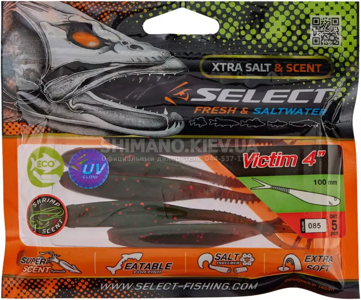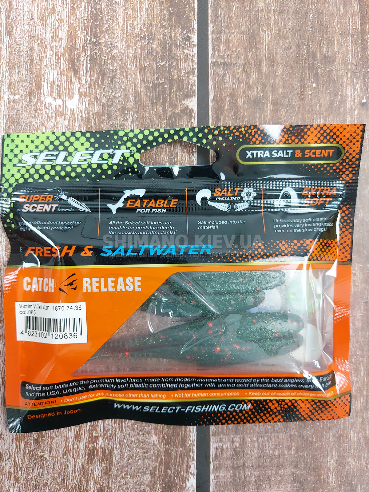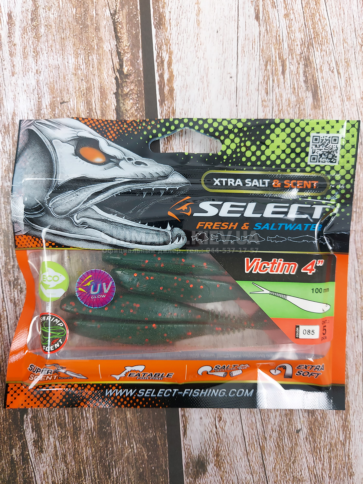 Силікон Select Victim V-Tail являє собою класичний слаг з V-подібним хвостом. Ребристе стерно хвоста сприяє збільшенню його міцності без шкоди рухливості. Приманка може оснащуватися на багато видів монтажів та різні типи гачків. Силікон ефективно працює при використанні, джигової техніки, дроп-шоту та повідцевого оснащення. Для підвищення ефективності ступінчастої проводки рекомендується у паузах виконувати похитування вершиною вудлища, що особливо провокує пасивну рибу. Додані до складу матеріалу сіль та атрактант збільшують привабливість приманки, оскільки вона залишає ароматний шлейф у воді та при обережному клюванні риба, відчуваючи їстівний смак, більш охоче захоплює слаг. Лінійка Victim V-Tail включає кілька розмірів від невеликих 2.5 дюймових до досить великих довжиною 6 дюймів. Така різноманітність дозволяє підібрати оптимальний варіант під певні види риби, а широка гама цікавих забарвлень ще більше підвищує ефективність у певних умовах на риболовлі.