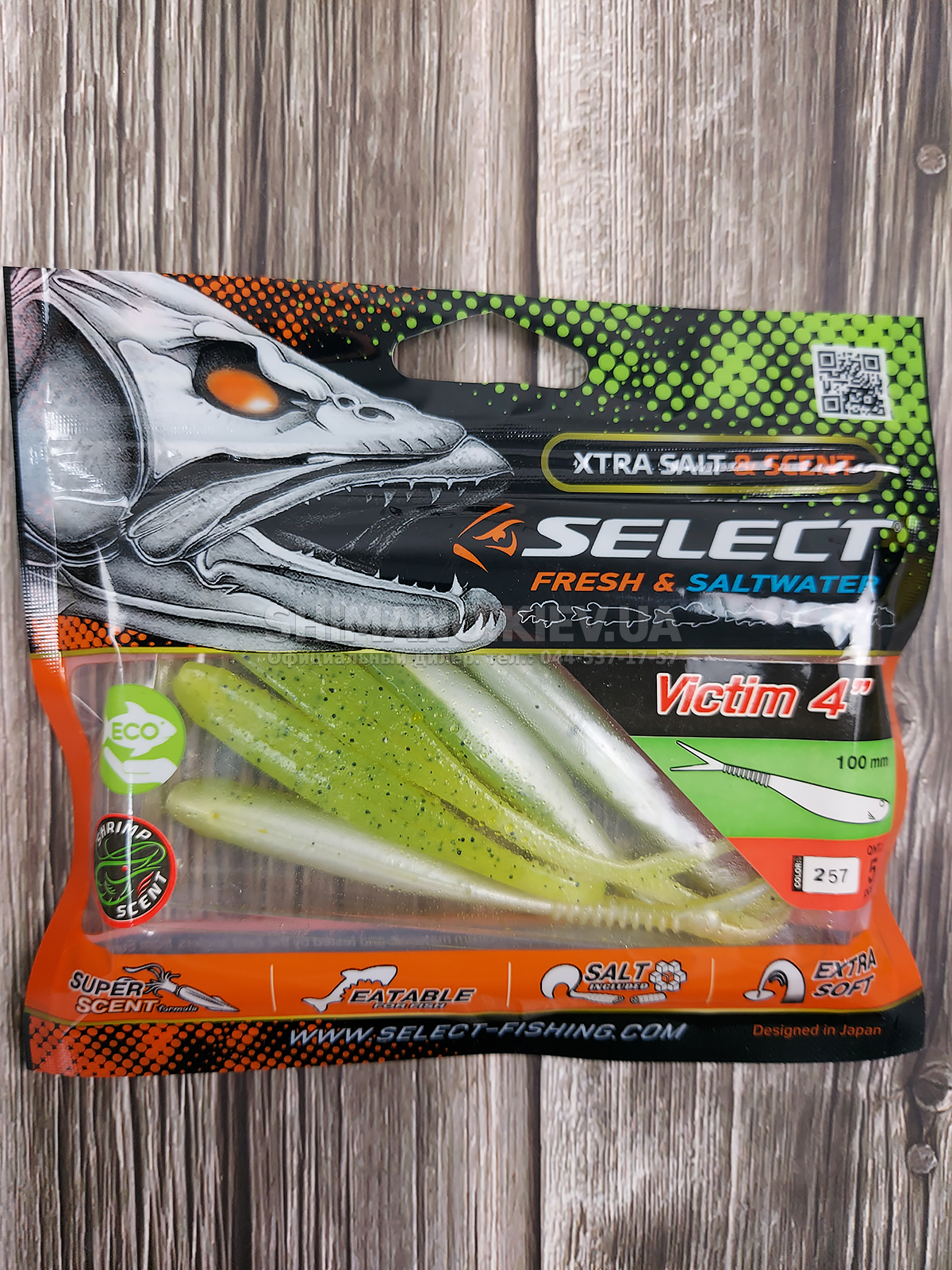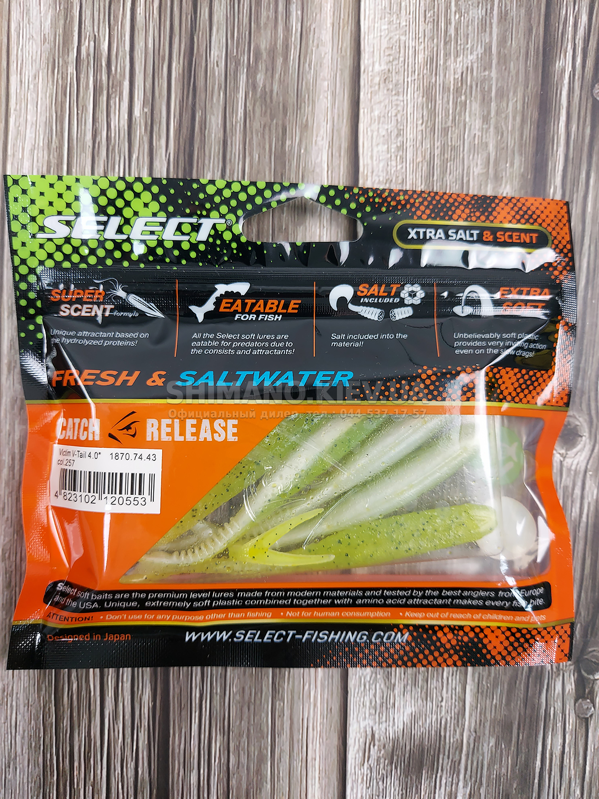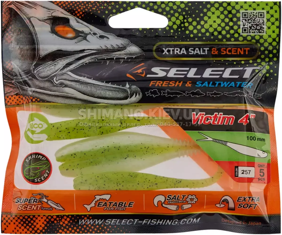 Силікон Select Victim V-Tail являє собою класичний слаг з V-подібним хвостом. Ребристе стерно хвоста сприяє збільшенню його міцності без шкоди рухливості. Приманка може оснащуватися на багато видів монтажів та різні типи гачків. Силікон ефективно працює при використанні, джигової техніки, дроп-шоту та повідцевого оснащення. Для підвищення ефективності ступінчастої проводки рекомендується у паузах виконувати похитування вершиною вудлища, що особливо провокує пасивну рибу. Додані до складу матеріалу сіль та атрактант збільшують привабливість приманки, оскільки вона залишає ароматний шлейф у воді та при обережному клюванні риба, відчуваючи їстівний смак, більш охоче захоплює слаг. Лінійка Victim V-Tail включає кілька розмірів від невеликих 2.5 дюймових до досить великих довжиною 6 дюймів. Така різноманітність дозволяє підібрати оптимальний варіант під певні види риби, а широка гама цікавих забарвлень ще більше підвищує ефективність у певних умовах на риболовлі.