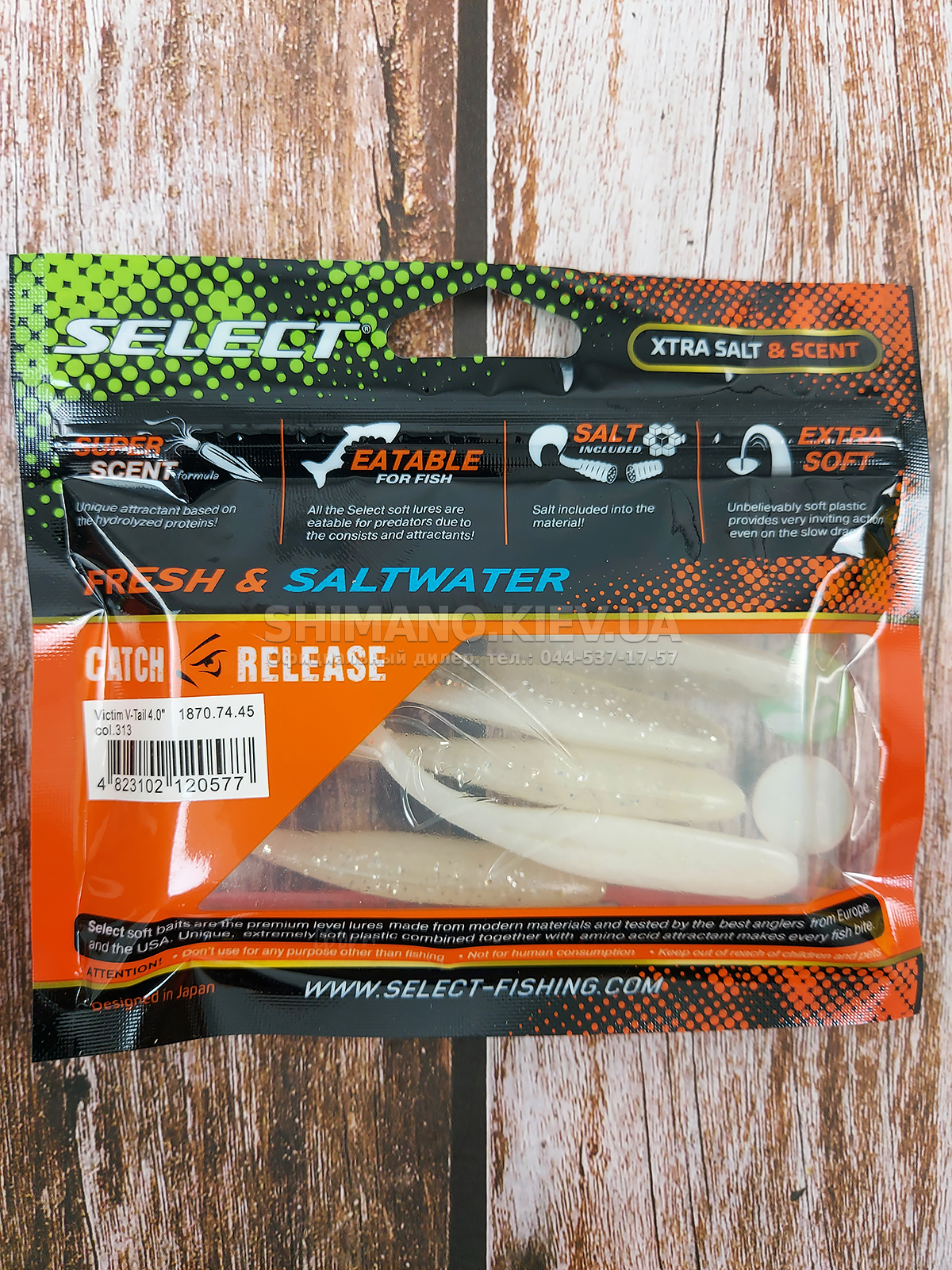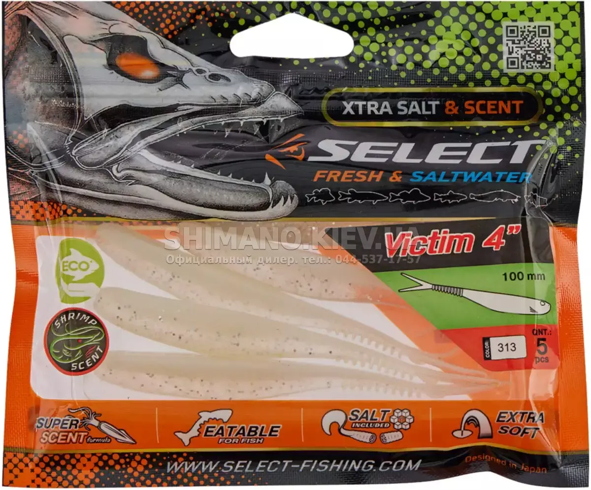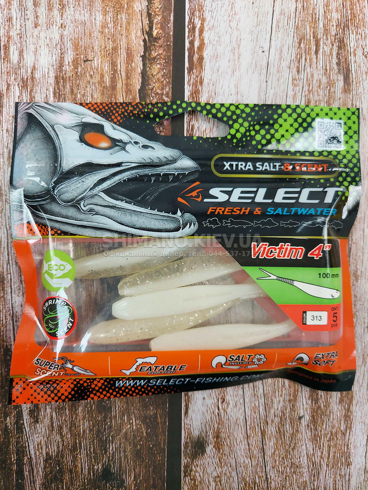 Силікон Select Victim V-Tail являє собою класичний слаг з V-подібним хвостом. Ребристе стерно хвоста сприяє збільшенню його міцності без шкоди рухливості. Приманка може оснащуватися на багато видів монтажів та різні типи гачків. Силікон ефективно працює при використанні, джигової техніки, дроп-шоту та повідцевого оснащення. Для підвищення ефективності ступінчастої проводки рекомендується у паузах виконувати похитування вершиною вудлища, що особливо провокує пасивну рибу. Додані до складу матеріалу сіль та атрактант збільшують привабливість приманки, оскільки вона залишає ароматний шлейф у воді та при обережному клюванні риба, відчуваючи їстівний смак, більш охоче захоплює слаг. Лінійка Victim V-Tail включає кілька розмірів від невеликих 2.5 дюймових до досить великих довжиною 6 дюймів. Така різноманітність дозволяє підібрати оптимальний варіант під певні види риби, а широка гама цікавих забарвлень ще більше підвищує ефективність у певних умовах на риболовлі.