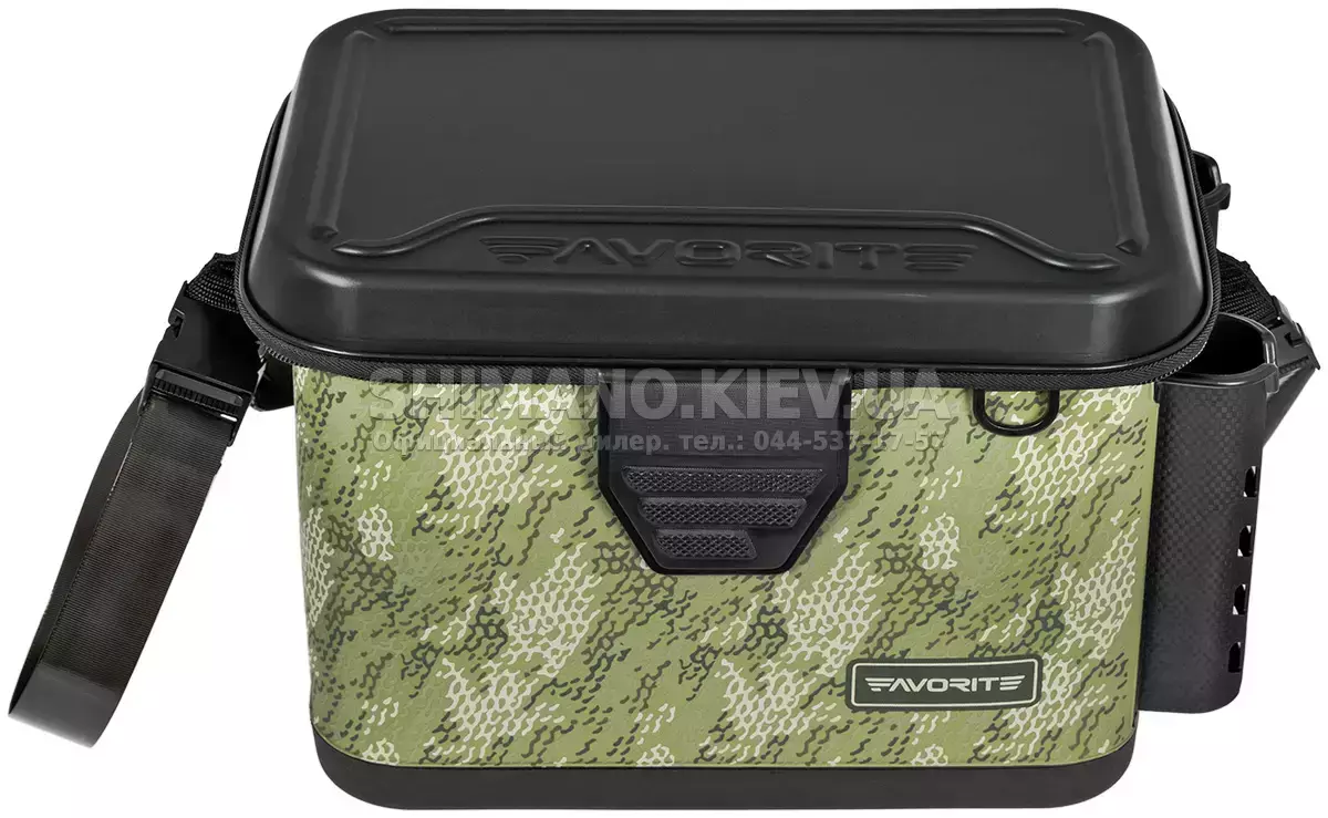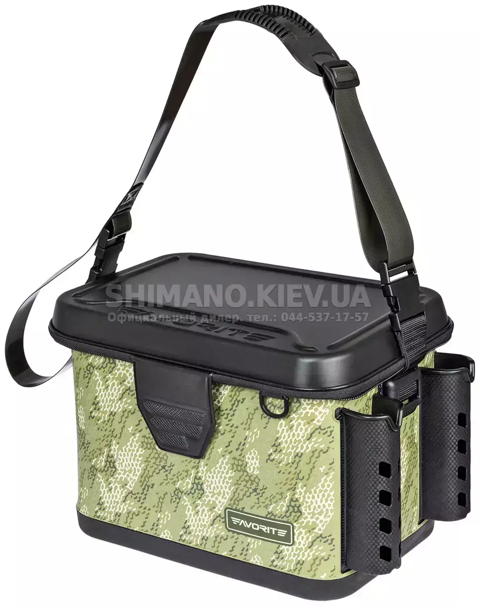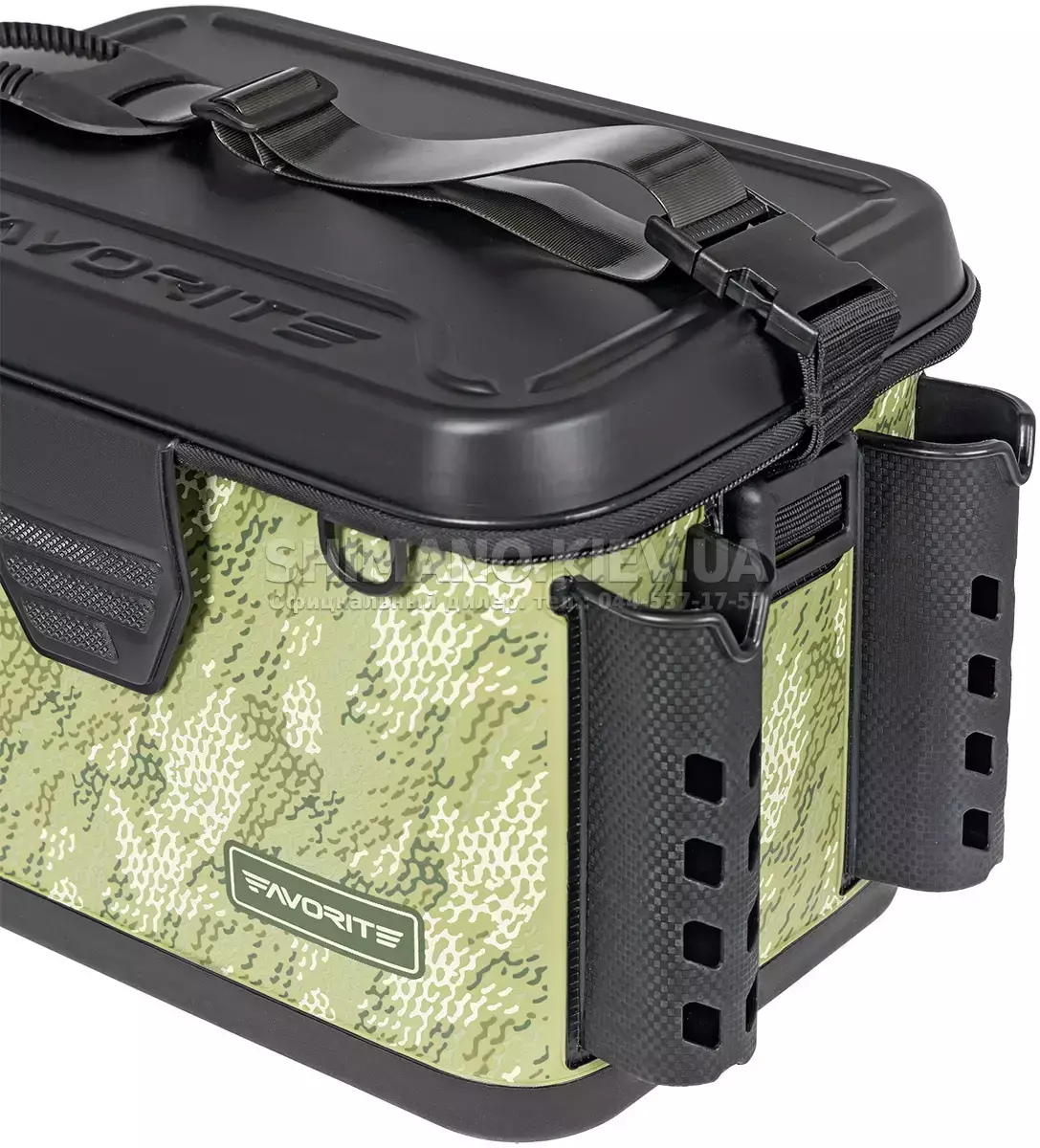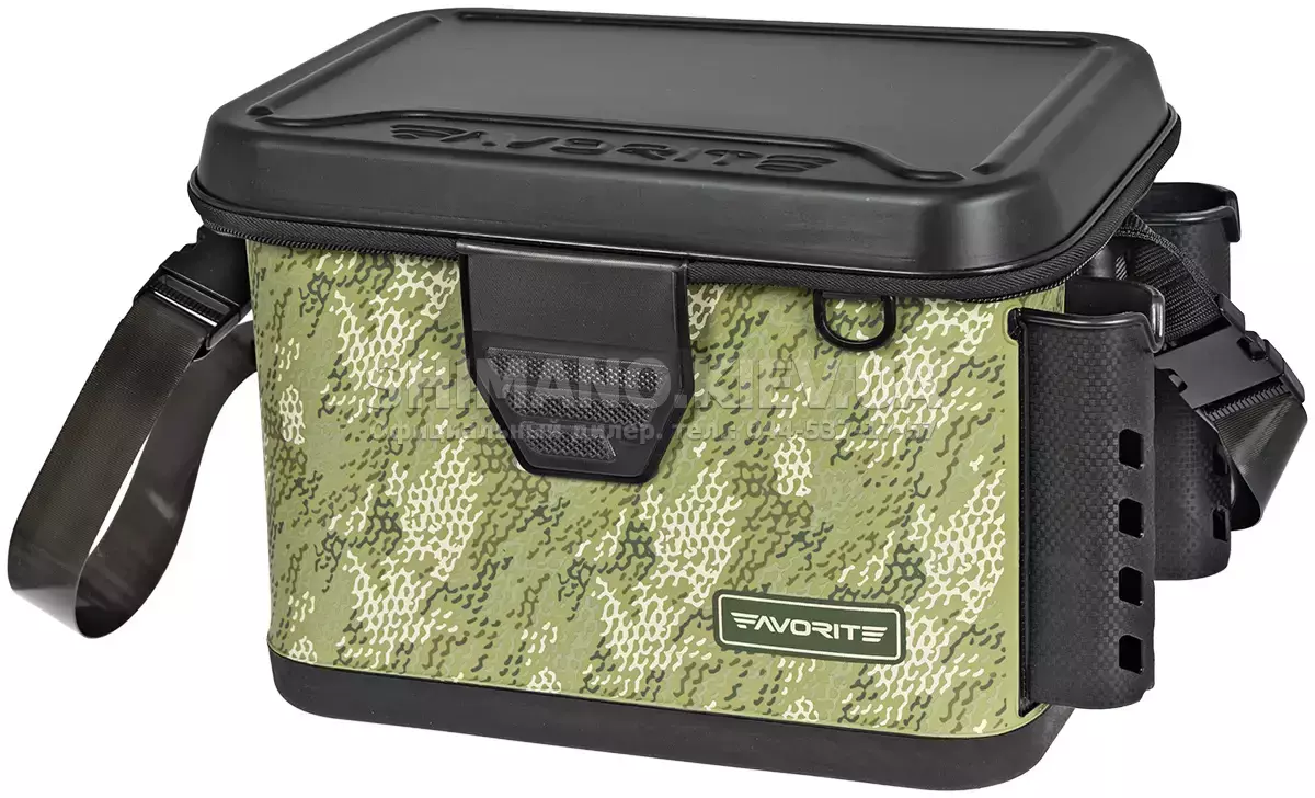Сумка Favorite Tackle Bakkan – легкий та зручний ящик з кришкою, який застосовується для зберігання та перенесення рибальських снастей. Вона виконана з EVA матеріалу, а її шви мають паяну конструкцію, тому вона є водонепроникною і при необхідності легко миється як зовні, так і всередині. Міцний каркас, завдяки литому жорсткому пластиковому дну, товстому дроту по канту зверху і дуже зносостійкій тканині EVA товщиною 1.8 мм, добре зберігає форму, тим самим захищаючи вміст від ударів та інших пошкоджень. Відкидна кришка закривається за допомогою великої надійної блискавки, яка в закритому стані може використовуватися як невеликий монтажний столик для снастей. Зовні сумка Favorite Tackle Bakkan з одного боку оснащена двома тримачами для вудилищ, а з іншого – D-подібним кільцем для кріплення рибальського інструменту (ліпгрипу, ретрівера тощо). Ще одне D-подібне кільце знаходиться на передній частині.
