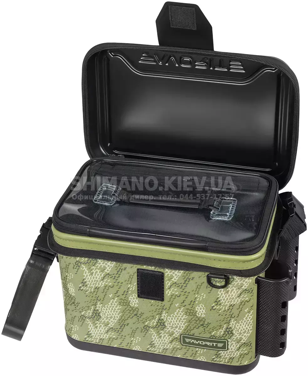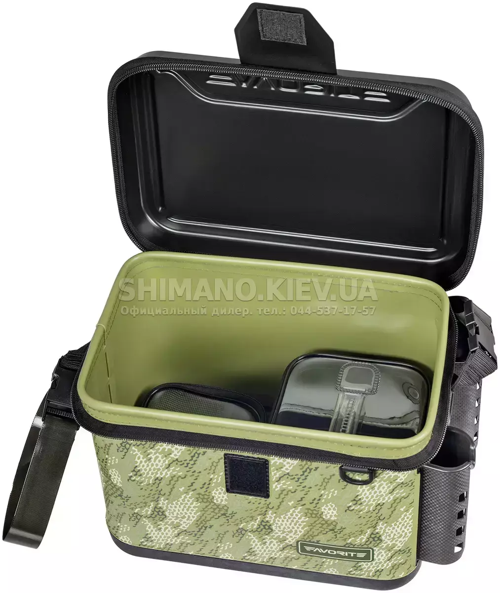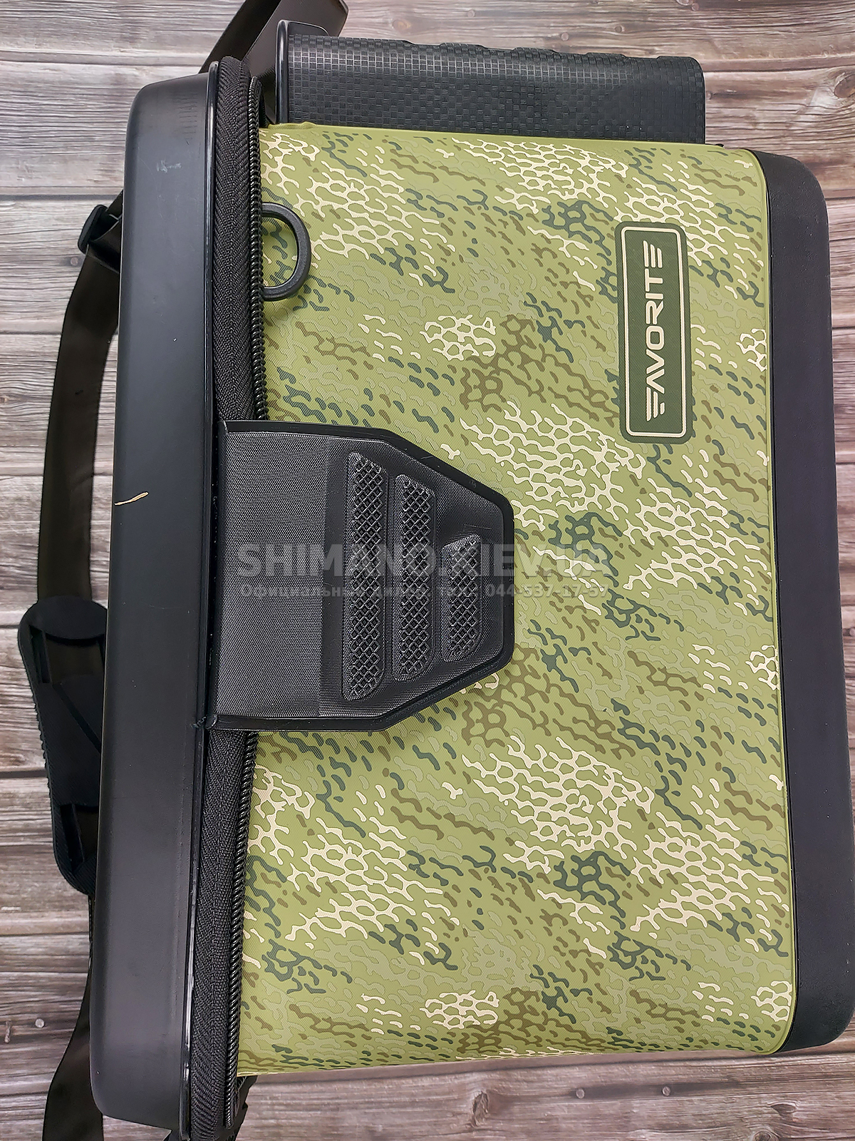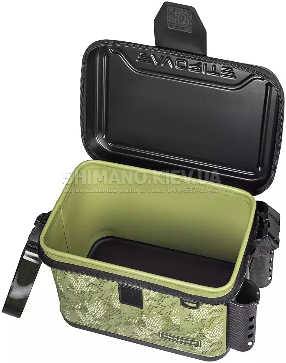 Сумка Favorite Tackle Bakkan – легкий та зручний ящик з кришкою, який застосовується для зберігання та перенесення рибальських снастей. Вона виконана з EVA матеріалу, а її шви мають паяну конструкцію, тому вона є водонепроникною і при необхідності легко миється як зовні, так і всередині. Міцний каркас, завдяки литому жорсткому пластиковому дну, товстому дроту по канту зверху і дуже зносостійкій тканині EVA товщиною 1.8 мм, добре зберігає форму, тим самим захищаючи вміст від ударів та інших пошкоджень. Відкидна кришка закривається за допомогою великої надійної блискавки, яка в закритому стані може використовуватися як невеликий монтажний столик для снастей. Зовні сумка Favorite Tackle Bakkan з одного боку оснащена двома тримачами для вудилищ, а з іншого – D-подібним кільцем для кріплення рибальського інструменту (ліпгрипу, ретрівера тощо). Ще одне D-подібне кільце знаходиться на передній частині.