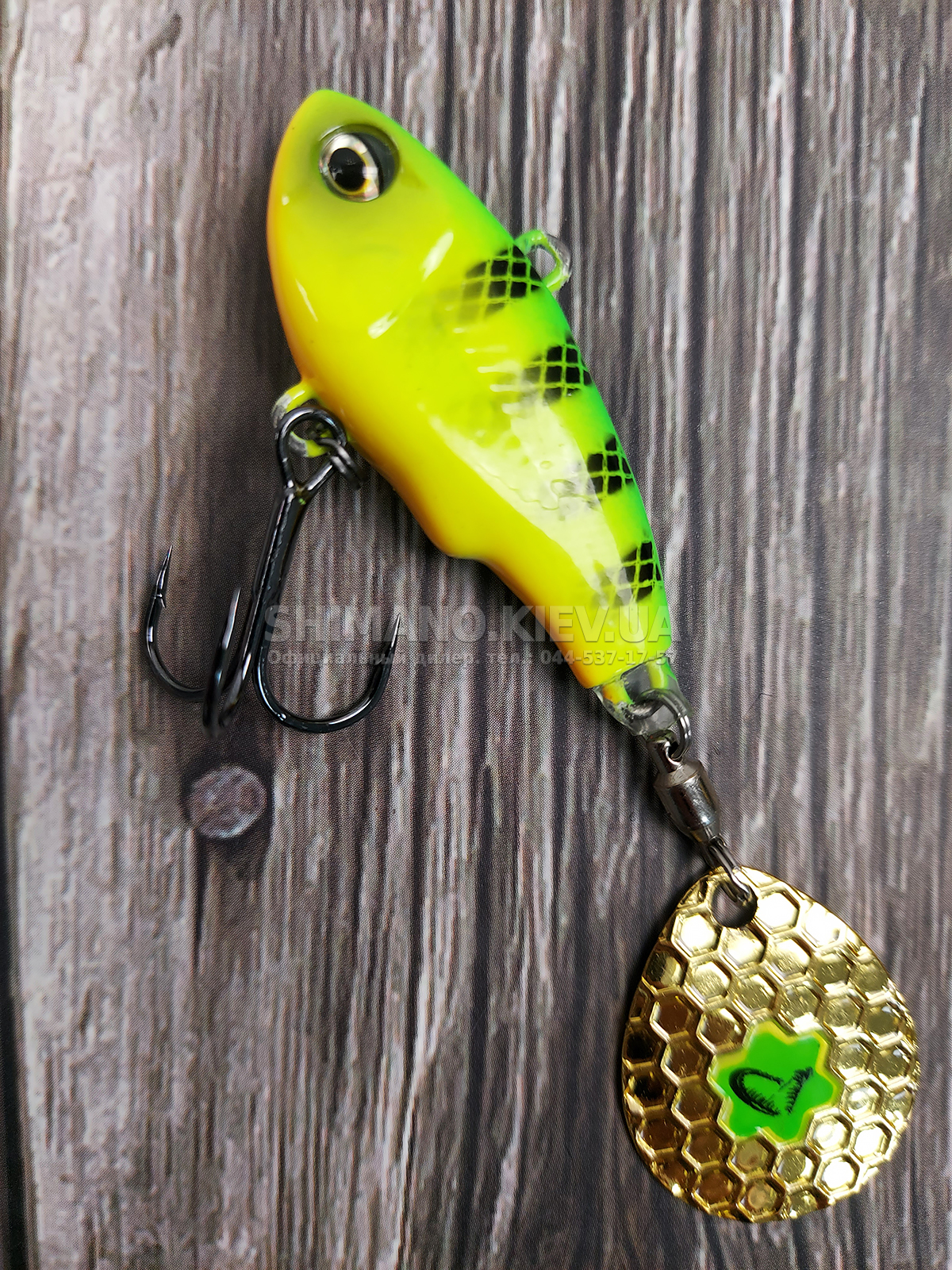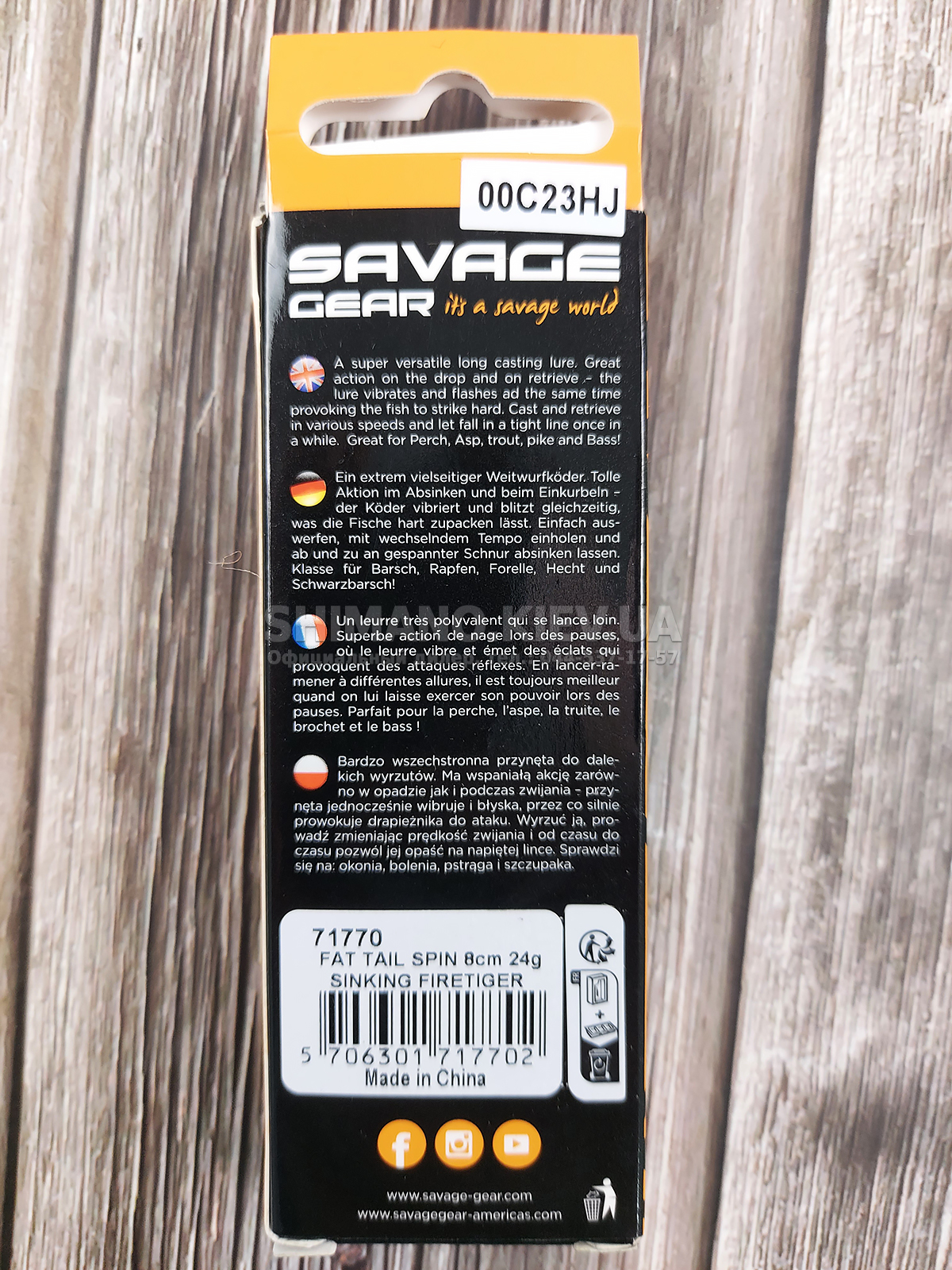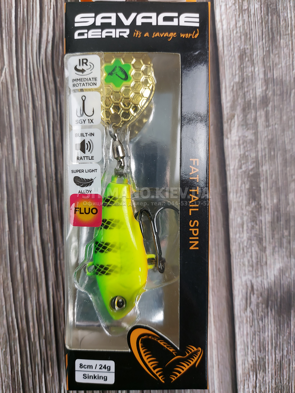 Тейл-спіннер Savage Gear Fat Tail Spin - приманка з важким металевим тілом і пелюсткою в задній частині. Така конструкція дозволяє блешні далеко і точно летіти під час закидання, стабільно вести себе під водою і продовжувати привабливо вібрувати на проводці і при вільному падінні. Пелюстка швидко запускається в роботу, вона створює потужну вібрацію і відблиски, які приваблюють рибу з великої відстані. Використовуючи тейл-спіннер, рибалка може швидко обловити широку ділянку водойми, при цьому, як товщу води, так і придонні шари водойми. Приманка добре піддається джиговій проводці, тому стає привабливою для таких видів риби, як: окунь, судак, щука і сом. Вона може стати гарною альтернативою силікону, так як радикально відрізняється від нього своєю грою і це може позитивно позначитися на клюваннях хижака.