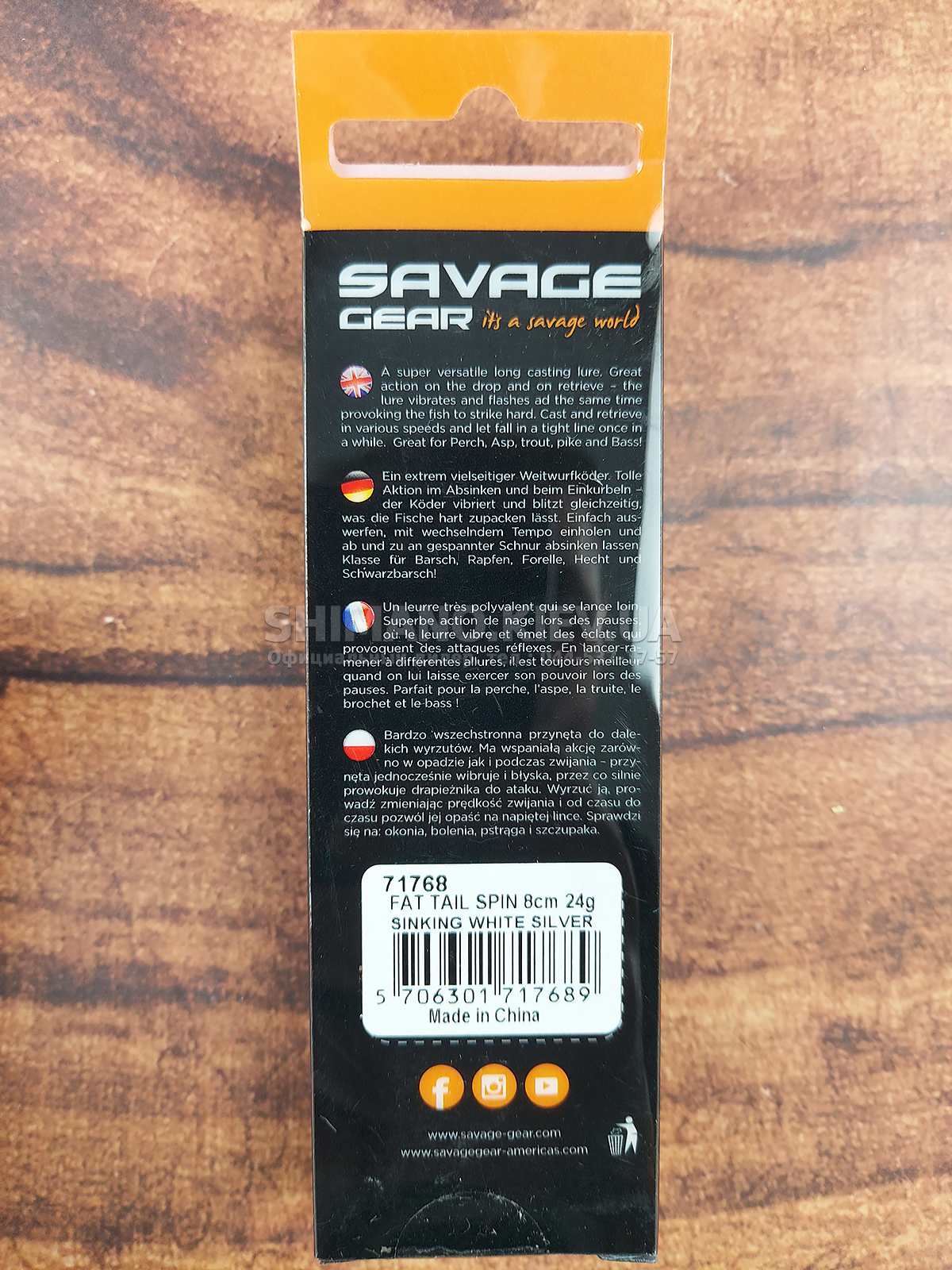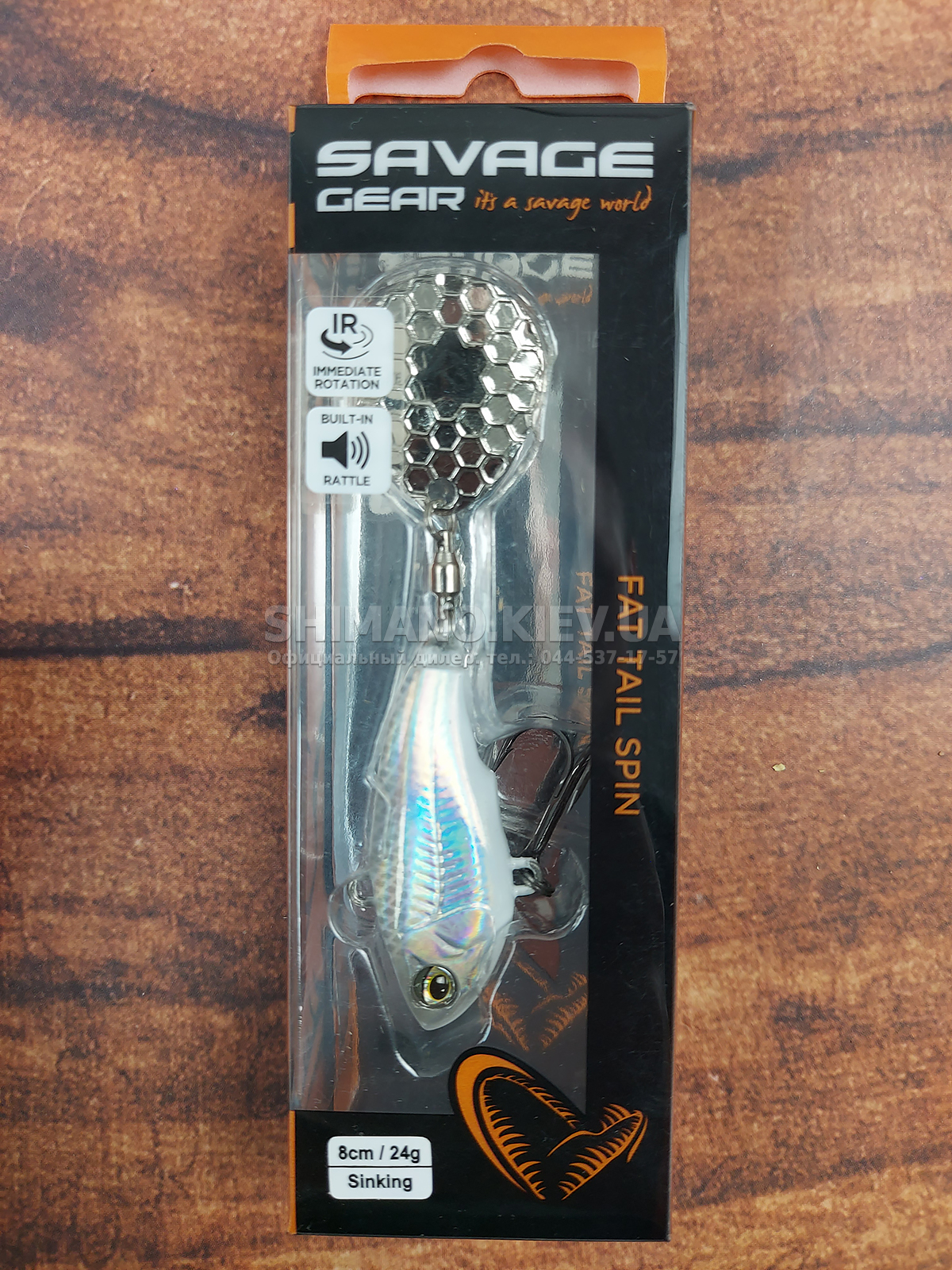 Тейл-спіннер Savage Gear Fat Tail Spin - приманка з важким металевим тілом і пелюсткою в задній частині. Така конструкція дозволяє блешні далеко і точно летіти під час закидання, стабільно вести себе під водою і продовжувати привабливо вібрувати на проводці і при вільному падінні. Пелюстка швидко запускається в роботу, вона створює потужну вібрацію і відблиски, які приваблюють рибу з великої відстані. Використовуючи тейл-спіннер, рибалка може швидко обловити широку ділянку водойми, при цьому, як товщу води, так і придонні шари водойми. Приманка добре піддається джиговій проводці, тому стає привабливою для таких видів риби, як: окунь, судак, щука і сом. Вона може стати гарною альтернативою силікону, так як радикально відрізняється від нього своєю грою і це може позитивно позначитися на клюваннях хижака.