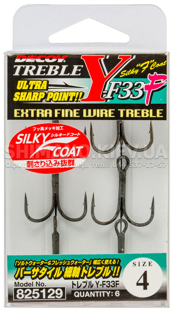 Трійник Decoy Y-F33F має класичну форму, відповідну для установки на воблери, блешні і силіконові приманки. Його особливістю є тефлонове покриття, що полегшує проникнення жала в пащу риби, і зменшує відблиски. Високоякісне заточення і мікроборідка гарантують вдале підсікання риби, при цьому, виключаючи її раптовий схід. Широкий модельний ряд дозволяє оснастити якісними трійниками приманку практично будь-якого розміру.
