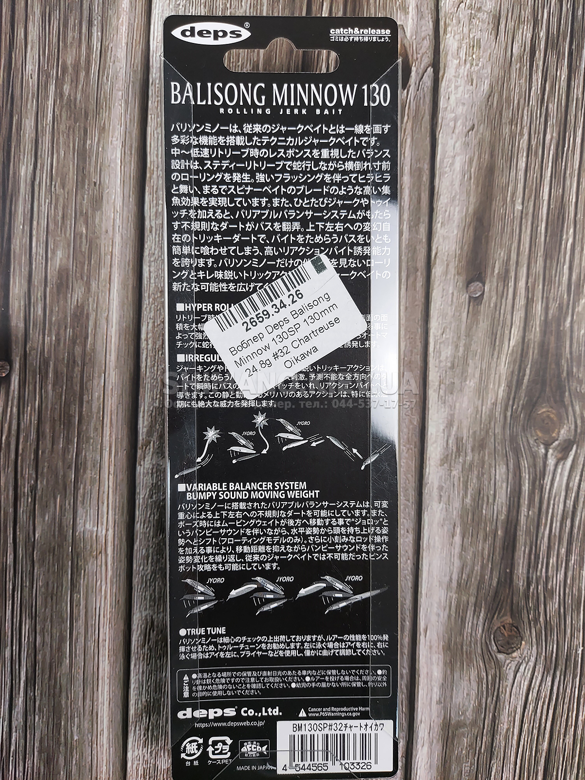 Воблер Deps Balisong Minnow акумулював усі основні властивості класичного джеркбейту типу мінноу. Лінійку складають кілька модельних рядів приманок розмірами 100 і 130 мм з позитивною плавучістю та суспендери. Воблери виготовляються із високоміцного ABS пластику для забезпечення належної міцності та надійності конструкції. Система балансування та далекого закидання PAT дозволяє досягти високої дальності та точності польоту та стабільної гри під час проведення. У якості вантажів у різних моделей використовуються сталеві або вольфрамові кульки. Воблери розміром 100 мм оснащуються двома потрійними гачками, 130 мм – трьома. Виробник рекомендує використовувати ривкову проводку при анімації воблерів серії Deps Balisong Minnow, за рахунок чого вдається досягти найефективнішої презентації. Воблер Deps Balisong Minnow розроблений провідними японськими експертами з урахуванням багатого досвіду та з використанням передових технологій та матеріалів. Його застосування на риболовлі гарантує високу ймовірність успіху при лові окуня щуки, судака та жереха.
