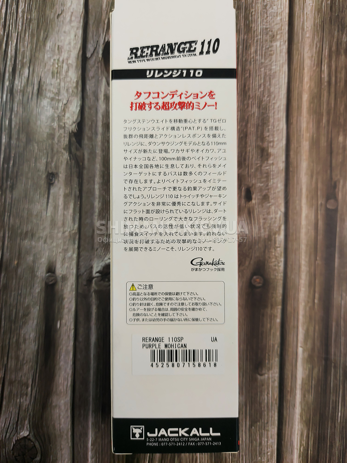 Jackall Rerange 110SP – довгоочікуваний «молодший брат» дуже популярного біг-мінно Rerange 130. Оснащений системою далекого закидання. виконаної у вигляді вольфрамового циліндра. який вільно переміщається у пластиковій капсулі.