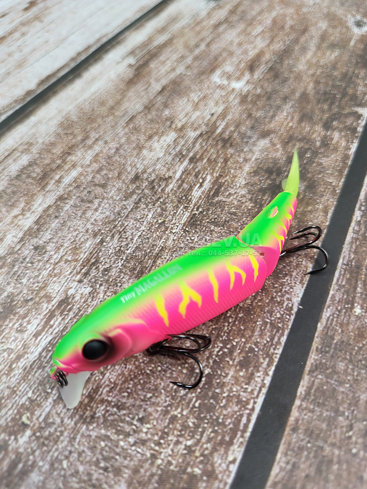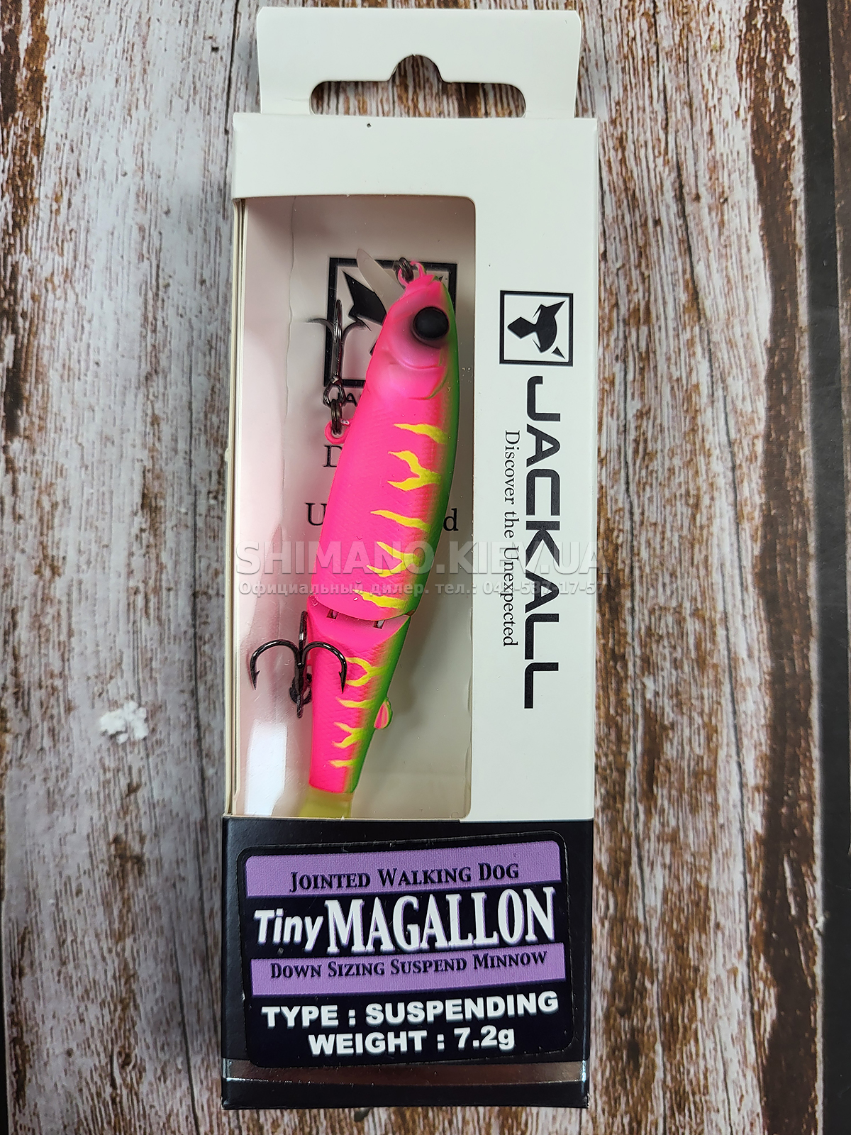 Воблер Jackall Tiny Magallon – компактна варіація моделі Magallon. має довжину 88 міліметрів. Двоскладове тіло з невеликим хвостовим фрагментом і м'яким хвостиком провокує на клювання навіть дуже пасивного хижака. Призначений для точкового облову конкретних локальних ділянок (вікна між травою. вздовж очерету або завалів корчів). а також коли хижак вийшов за іншою приманкою та її не атакував. Тут потрібен особливий підхід – тут потрібен Tiny Magallon. Застосовувати його масово просто не цікаво - багато наших рибалок називають його "пилосос" бо підмітає він також щуку розміром з сам воблер.
