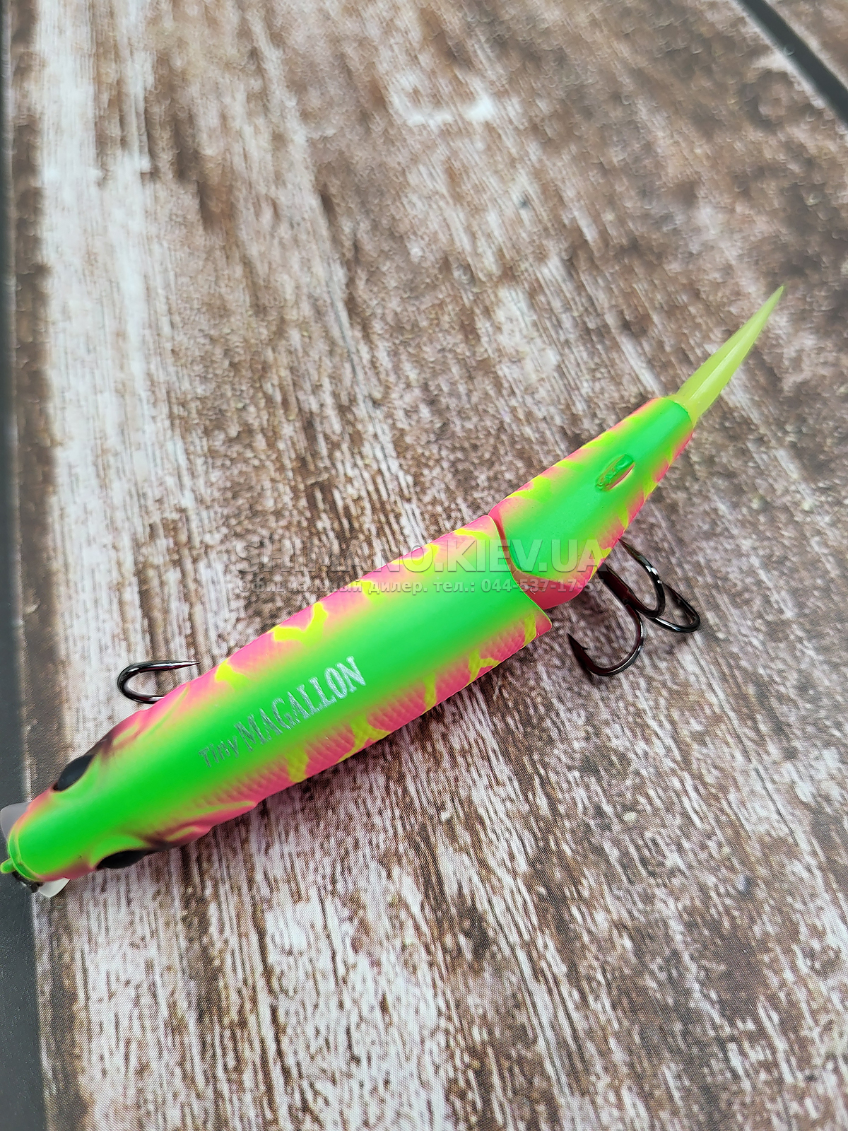 Magallon – двоскладовий воблер з оригінальним дизайном. У хвостовій частині розташовується м'який. але стійкий до щучих зубів. хвостик. який під час проведення додатково спокушає рибу. Навіть при малій амплітуді ривків спінінга здійснює розгонисті розвороти та кульбіти у воді. спокушаючи навіть не активного хижака.