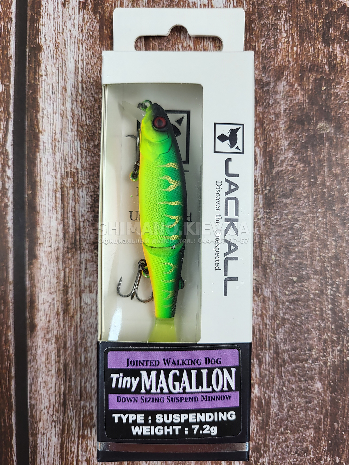 Воблер Jackall Tiny Magallon – компактна варіація моделі Magallon. має довжину 88 міліметрів. Двоскладове тіло з невеликим хвостовим фрагментом і м'яким хвостиком провокує на клювання навіть дуже пасивного хижака. Призначений для точкового облову конкретних локальних ділянок (вікна між травою. вздовж очерету або завалів корчів). а також коли хижак вийшов за іншою приманкою та її не атакував. Тут потрібен особливий підхід – тут потрібен Tiny Magallon. Застосовувати його масово просто не цікаво - багато наших рибалок називають його "пилосос" бо підмітає він також щуку розміром з сам воблер.