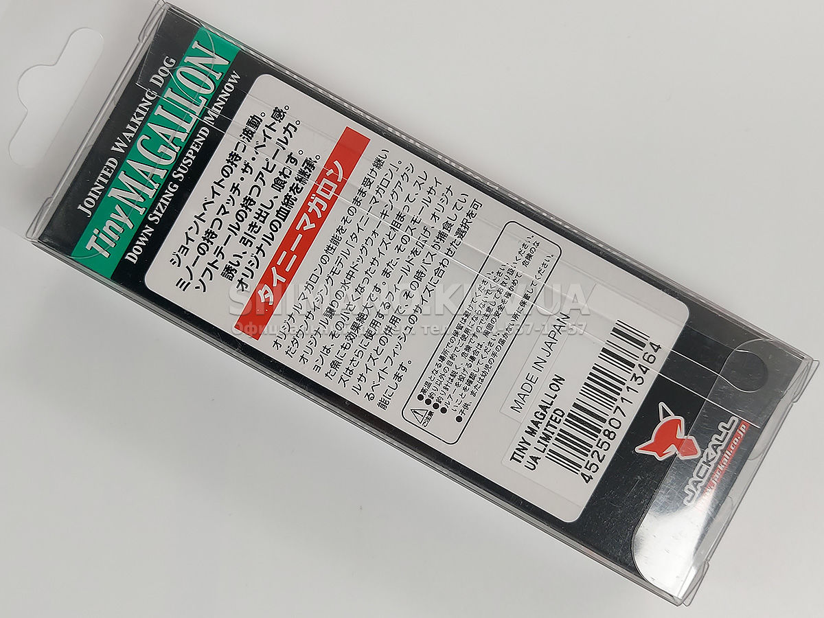 Воблер Jackall Tiny Magallon – компактна варіація моделі Magallon. має довжину 88 міліметрів. Двоскладове тіло з невеликим хвостовим фрагментом і м'яким хвостиком провокує на клювання навіть дуже пасивного хижака. Призначений для точкового облову конкретних локальних ділянок (вікна між травою. вздовж очерету або завалів корчів). а також коли хижак вийшов за іншою приманкою та її не атакував. Тут потрібен особливий підхід – тут потрібен Tiny Magallon. Застосовувати його масово просто не цікаво - багато наших рибалок називають його "пилосос" бо підмітає він також щуку розміром з сам воблер.