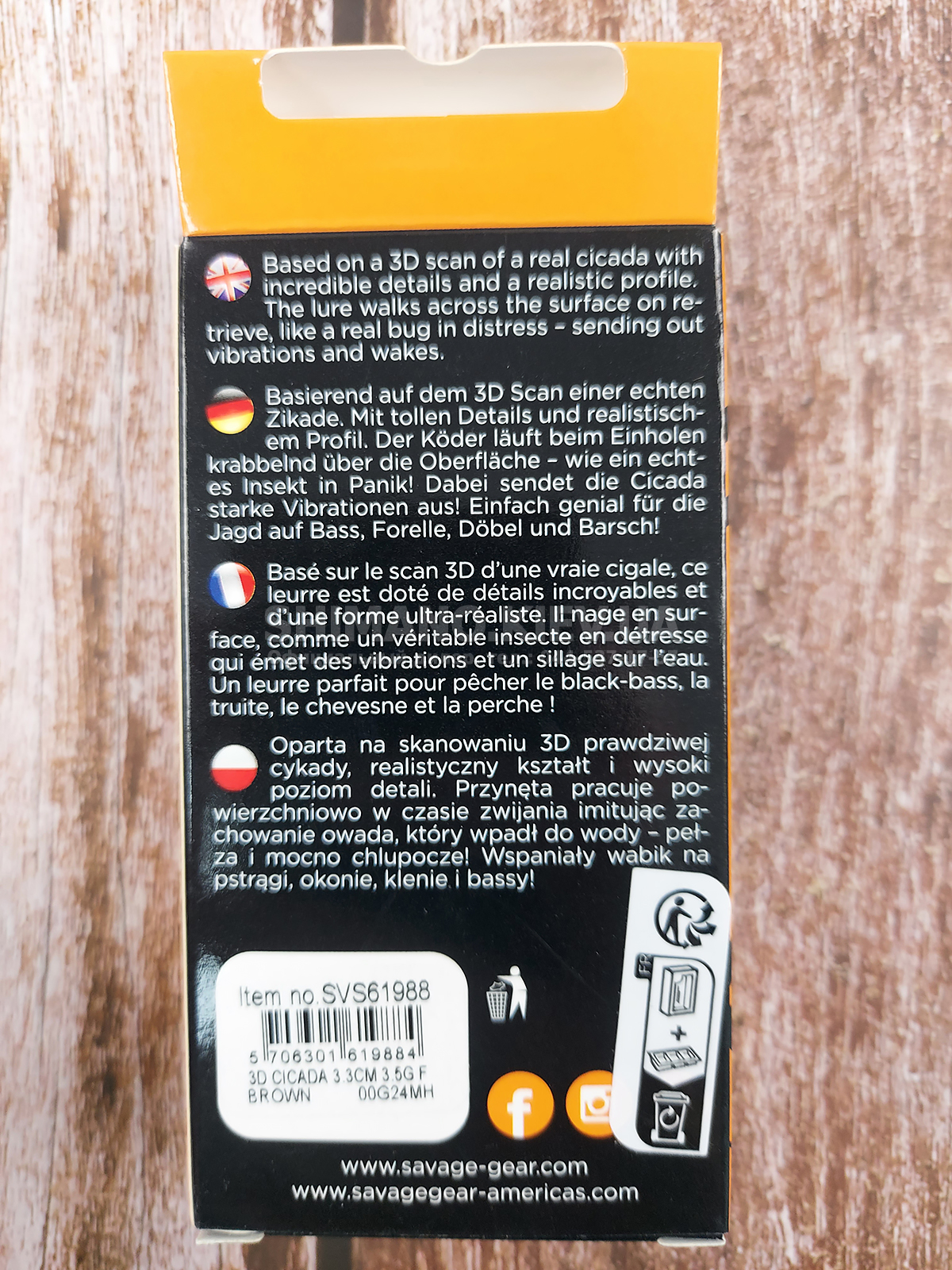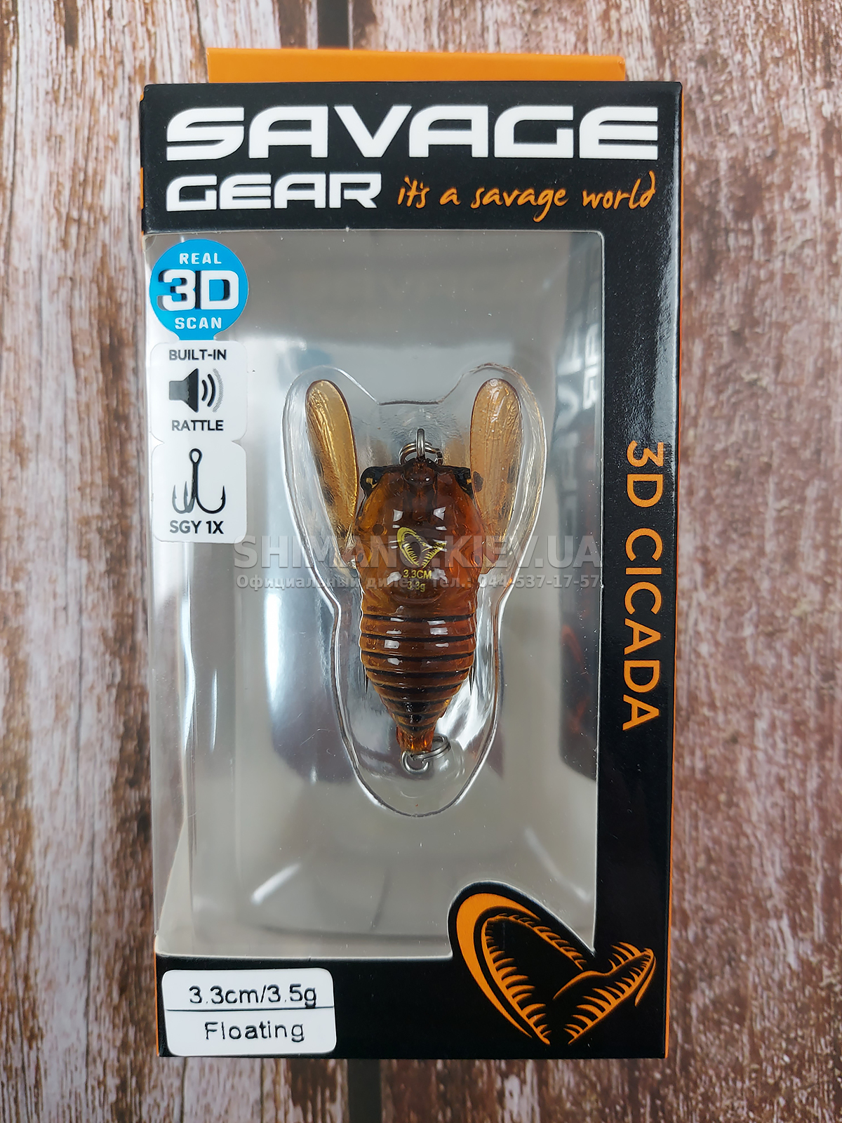Воблер Savage Gear 3D Cicada - класичний кроулер для лову хижих і всеїдних риб з поверхні. Приманка імітує велику комаху, яке впала в воду і безпорадно борсається на поверхні. Для цього слід підбирати характер проводки дослідним шляхом, виходячи з безлічі умов в конкретних ситуаціях. Як правило, воблер підсмикують короткими ривками, злегка протягують по поверхні, зупиняють на місці з легким тремтінням. На воблер Savage Gear 3D Cicada можуть зазіхнути багато хижих риб в наших широтах, найбільш вірогідні клювання головня, окуня, щуки і жереха, не виключені атаки великого в’ язя.