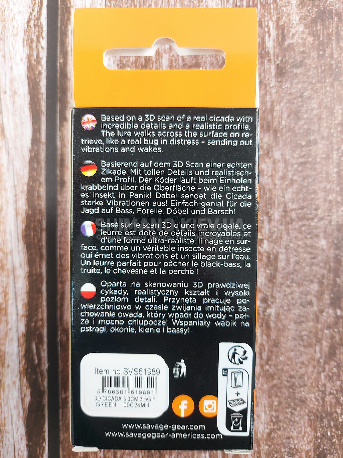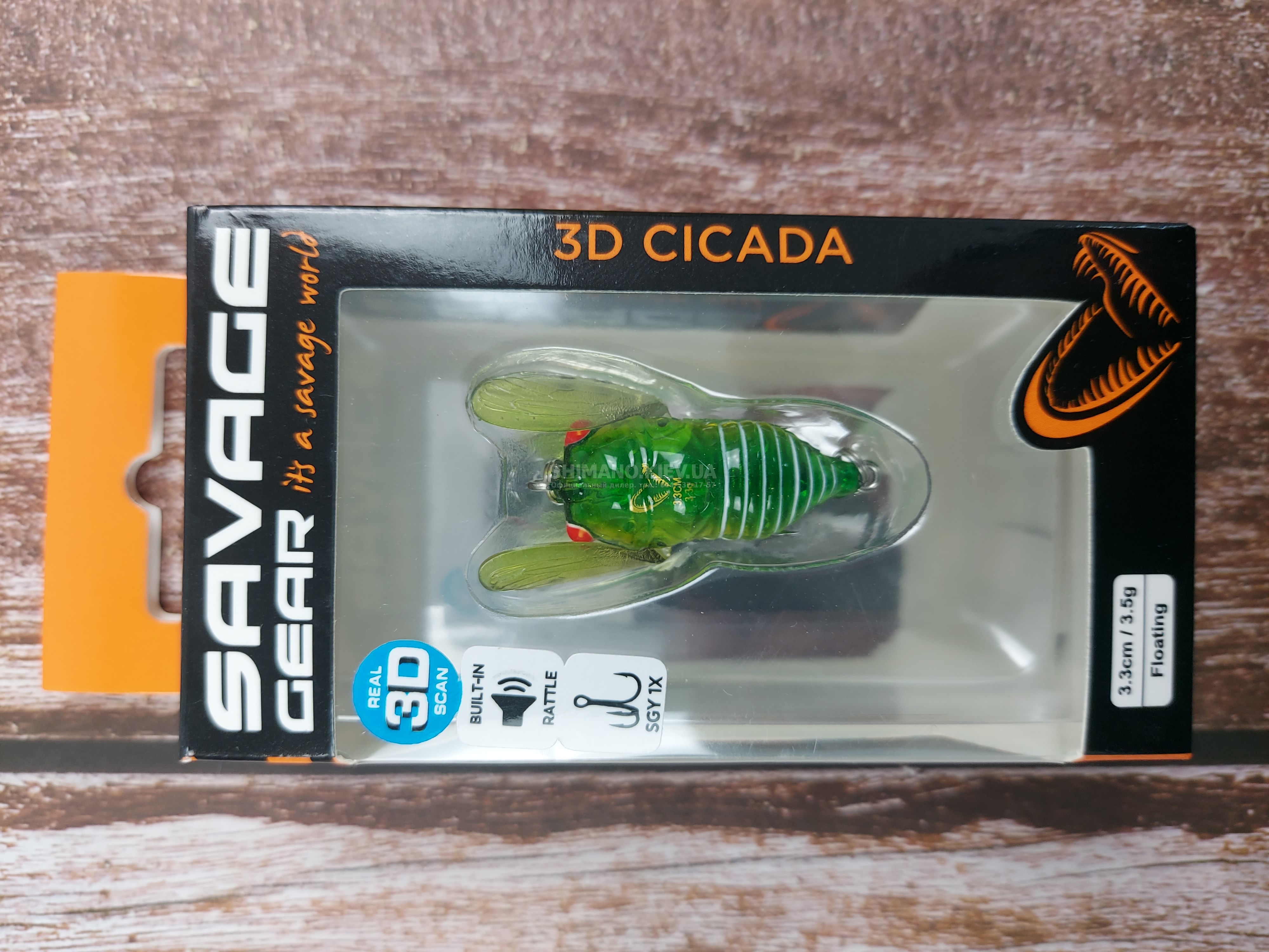 Воблер Savage Gear 3D Cicada - класичний кроулер для лову хижих і всеїдних риб з поверхні. Приманка імітує велику комаху, яке впала в воду і безпорадно борсається на поверхні. Для цього слід підбирати характер проводки дослідним шляхом, виходячи з безлічі умов в конкретних ситуаціях. Як правило, воблер підсмикують короткими ривками, злегка протягують по поверхні, зупиняють на місці з легким тремтінням. На воблер Savage Gear 3D Cicada можуть зазіхнути багато хижих риб в наших широтах, найбільш вірогідні клювання головня, окуня, щуки і жереха, не виключені атаки великого в’ язя.
