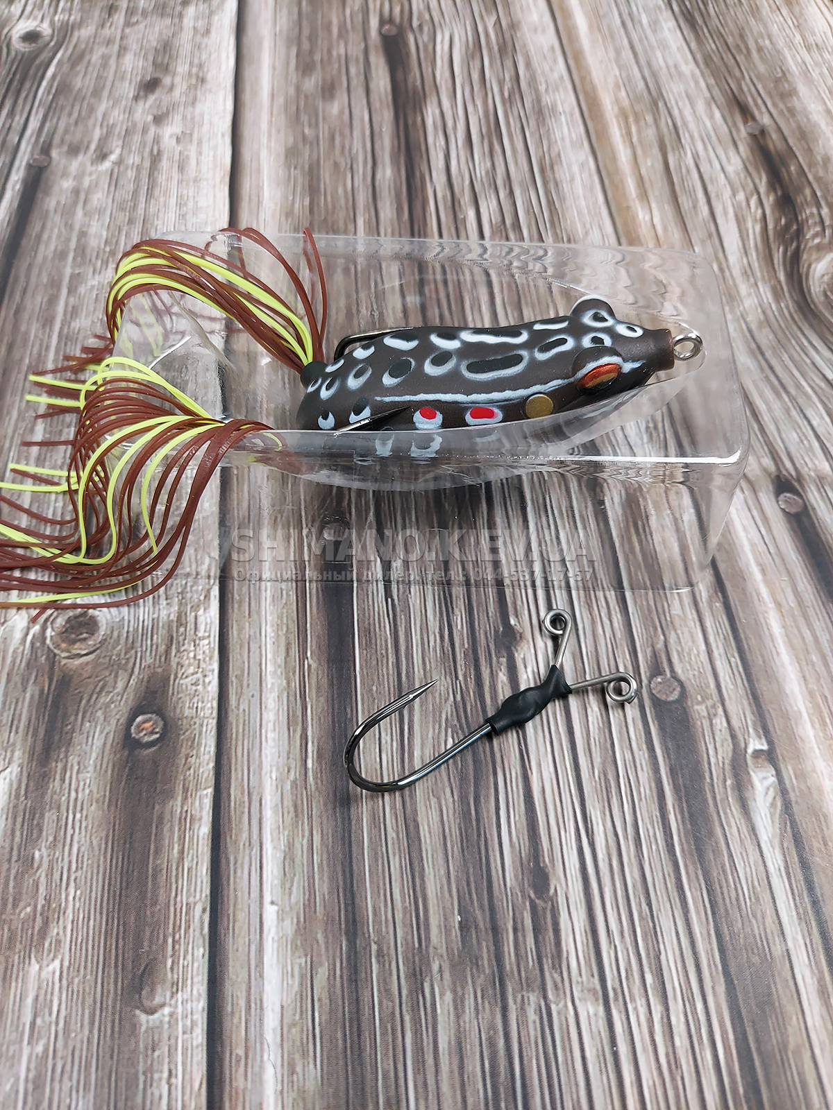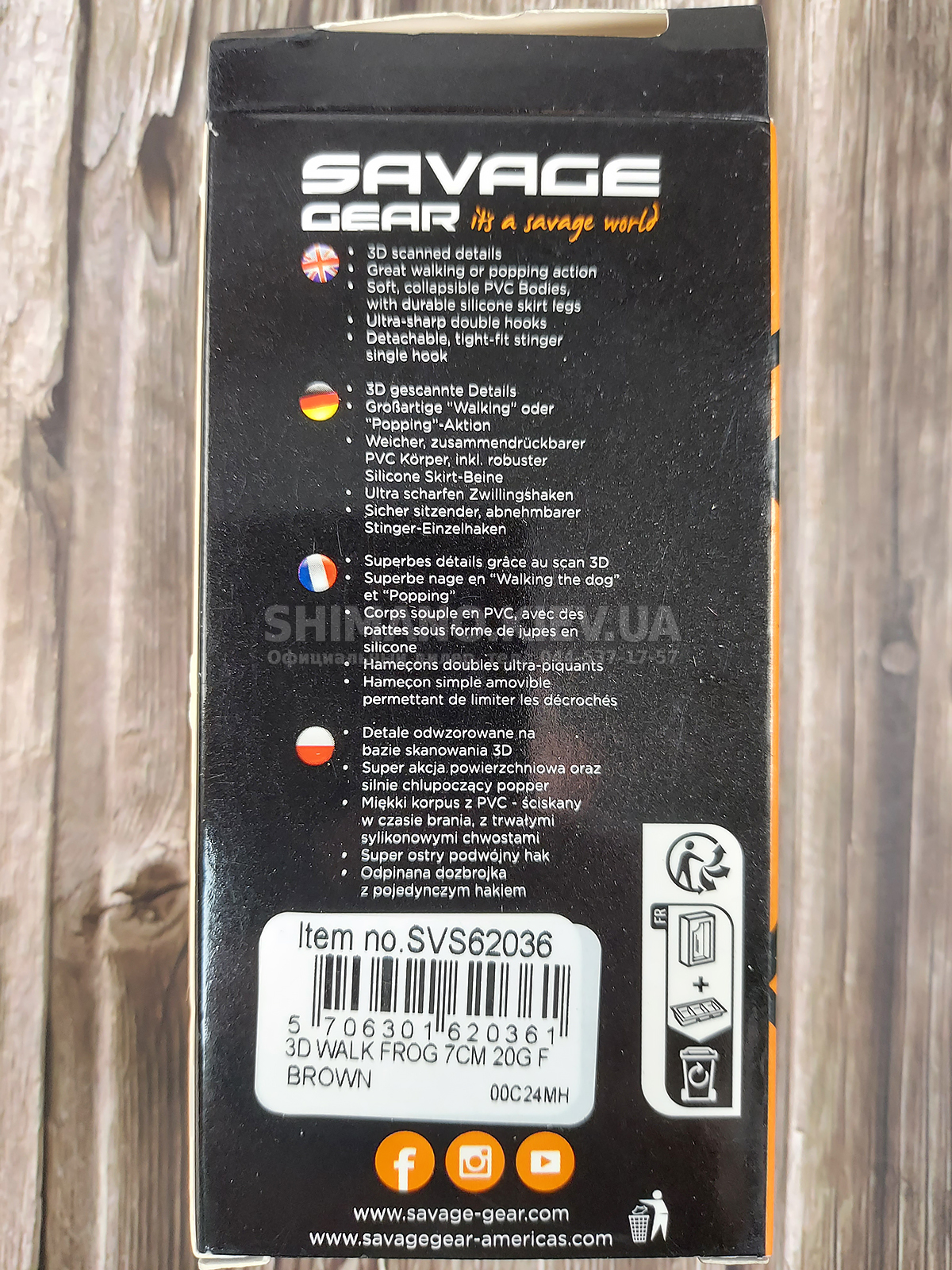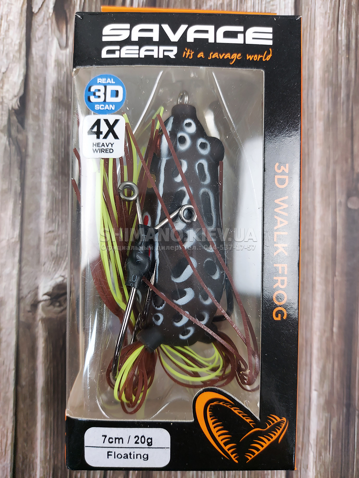 Savage Gear 3D Walk Frog - оригінальний волкер імітує плаваючу по поверхні води жабу. Тіло приманки виконано з м'якого ПВХ, в нього вставлений подвійний гачок, жала якого спрямовані верх і знаходяться практично на одному рівні з поверхнею воблера. Така конструкція дозволяє проводити приманку на ділянках водойми, які сильно закоряжені або заповнені водною рослинністю. При хватці риба легко продавлює м'який матеріал і засікається на гачок. Під час ривкової проводки, воблер «нишпорить» з боку в бік по поверхні, залучаючи своїми рухами рибу. Пучки гнучких силіконових ниток імітують рухомі задні лапи земноводного. У комплект входить додатковий одинарний гачок, який можна додати для кращої реалізації клювань. Savage Gear 3D Walk Frog добре зарекомендував себе при ловлі щуки і баса.- м'який ПВХ;