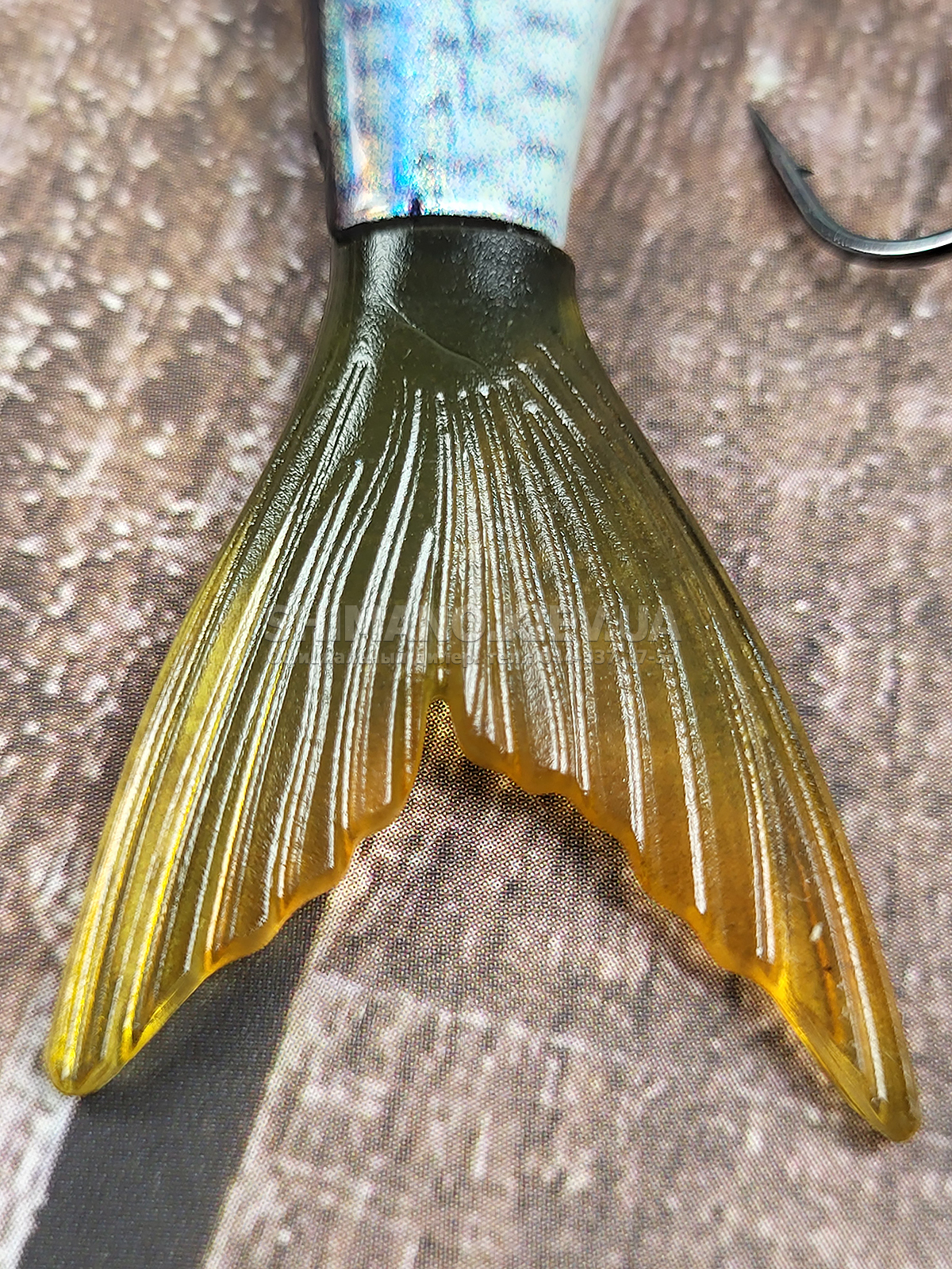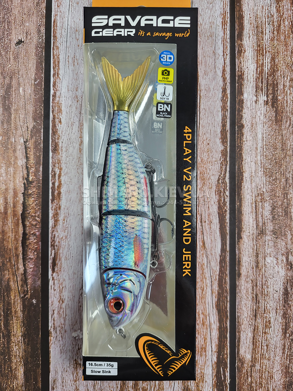 V2 Swim & Jerk - це оновлена версія вже перевіреного часом безлопатевого свімбейта від Savage Gear. Воблер випускається в трьох розмірах - 13,5, 16,5 и 20 сантиметрів, і розподілом ваги від 18, 32, 65 грамів відповідно. Додаткову реалістичність V2 Swim & Jerk отримала завдяки використанню фірмового забарвлення. Виконана за допомогою технології 3D сканування прототипу. Навіть найважчою версією 3D 4Play V2 Swim & Jerk легко управляти, вона безлопатева і, як наслідок, абсолютно не створює опору. У проводці свімбейт абсолютно невибагливий - V2 Swim & Jerk відмінно реагує на різноманітні ривки і навіть плавні. Практично при будь-яких маніпуляціях цей невеликий джерк грає стабільно і дуже привабливо. При правильній проводці трискладового воблера малює плавну «змію», а на паузі повільно тоне, злегка похитуючи своїми високими плоскими боками щодо поздовжньої осі. Приманка дуже універсальна по горизонту проводки - її при необхідності можна провести як під самою поверхнею, так і біля дна навіть на великих глибинах. Найдрібніший розмір цього свімбейта краще використовувати не тільки для ловлі щуки і судака, а й в спробах спокусити і великих окунів, також для полювання на трофейну щуку.