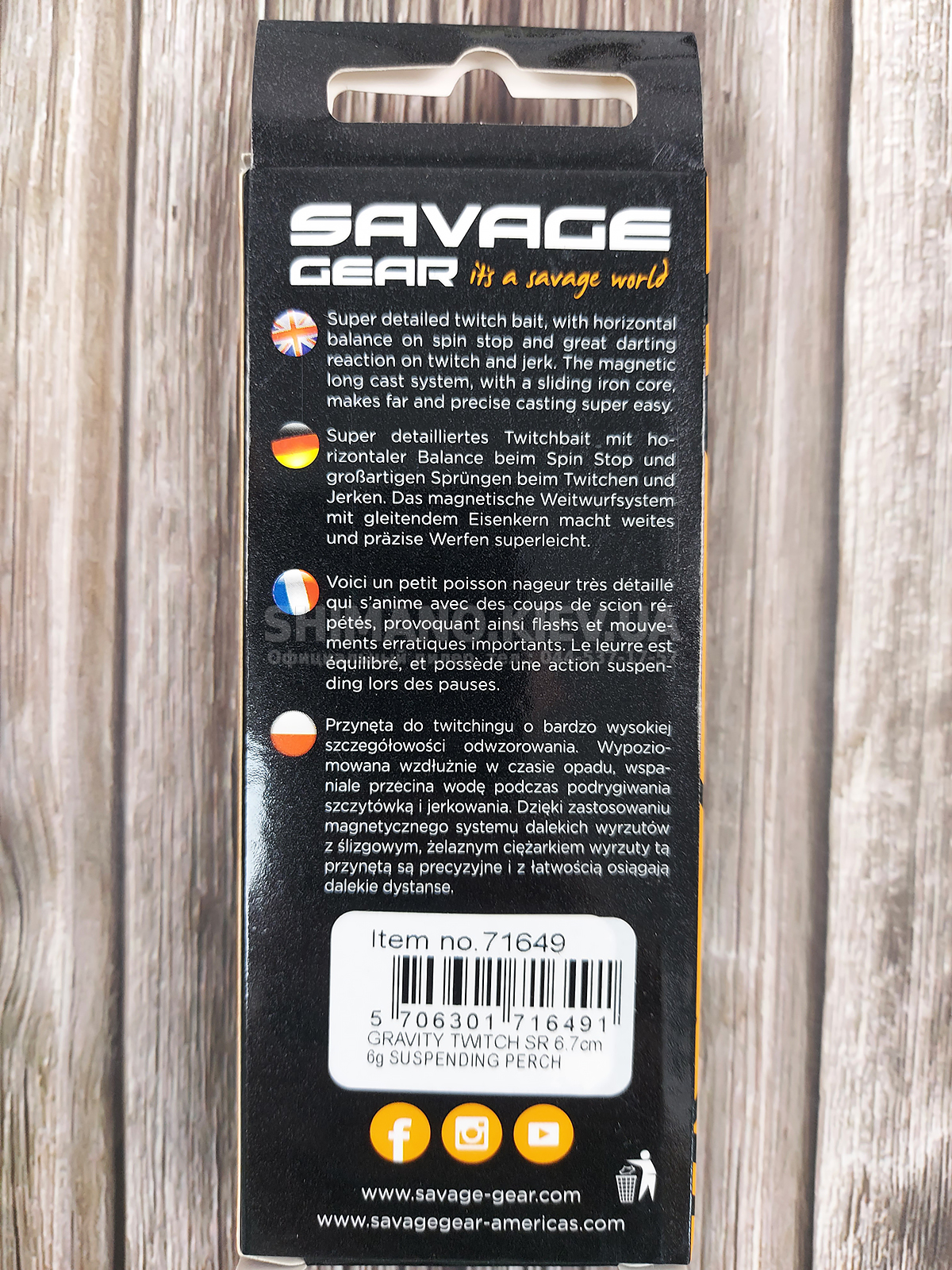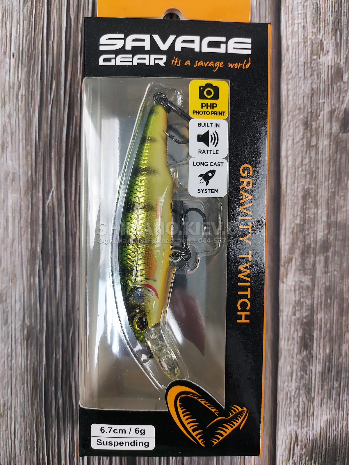 Воблер Savage Gear Gravity Twitch - класичний мінноу для ривкової проводки, але який володіє виразною власною грою на рівномірці. Такі особливості його поведінки дозволяють комбінувати стилі проводки для спокушання на клювання найобережнішої риби. Воблер має нейтральну плавучість, тому тривалі паузи можуть спрацьовувати в тих випадках, коли хижак довго не вирішується на хватку. Візуальну привабливість забезпечують реалістичні кольори, а щоб риба знайшла його місце знаходження з великої відстані, він оснащений брязкальцем. Дана приманка має систему далекого закидання, яка дозволяє добитися далекого і рівного польоту під час закидання.