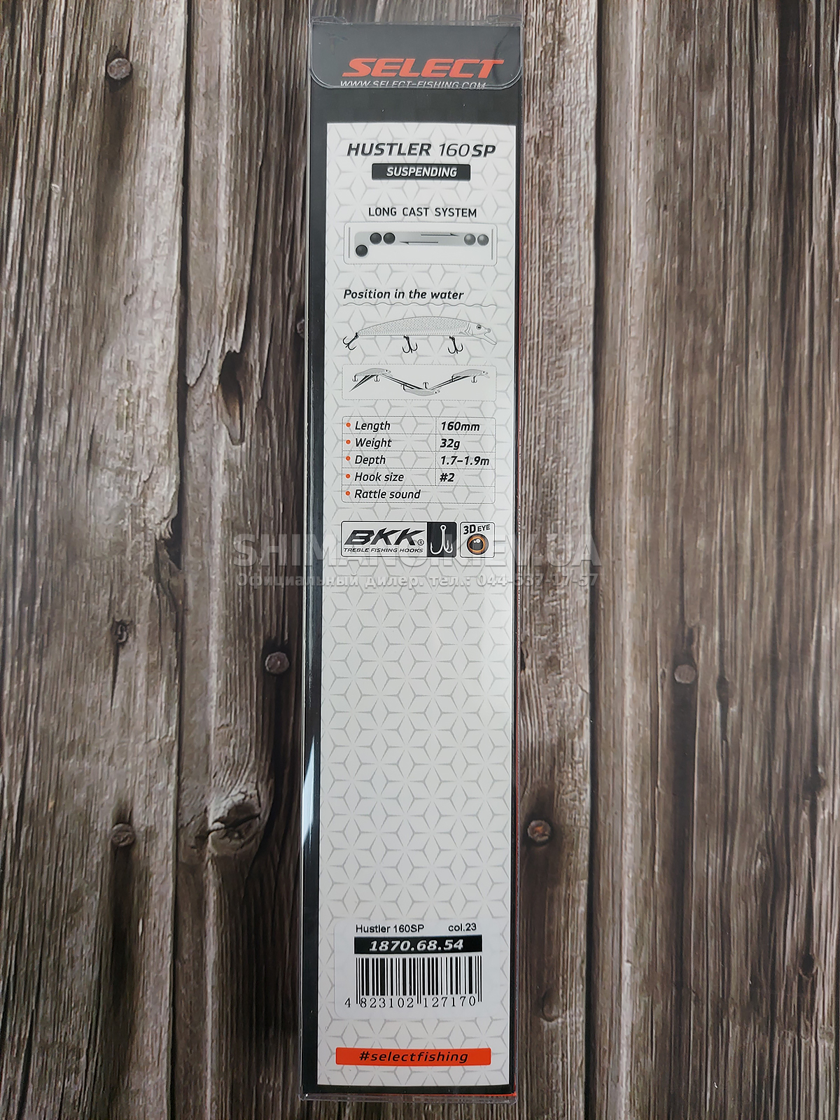 Воблер Select Hustler - велика приманка для лову щуки. Але, незважаючи на свої розміри, на нього впевнено клює як крупна, так і невелика риба масою до 1 кг. Воблер має специфічну плоску форму, що наділяє його унікальною грою. На простій рівномірній проводці він активно перевалюється з боку на бік, але найбільшу привабливість має під час твічингу, йдучи в сторони та зависаючи на одному місці з похитуваннями боками. Для підвищення польотних характеристик воблер оснащений системою далекого закидання, яка, не дивлячись на парусність приманки, стабілізує його в повітрі і дозволяє летіти в певне місце.
