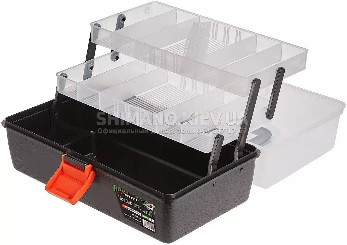 Ящик Select Tackle Box використовується для перенесення та зберігання рибальських снастей і аксесуарів. Конструкція з відкидними полицями дозволяє тримати в піддоні більші елементи (невелику котушку, моток волосіні і т.п.), а в верхніх відсіках розмістити різні приманки, вантажі та інші елементи оснащення. Ящик виконаний з пластика, стійкого до невеликих ударів і подряпин, тому при дбайливому ставленні він прослужить не один сезон. Відкидна кришка закріплена за допомогою поворотних петель і фіксується надійною застібкою, що запобігає випадкове відкривання. Для перенесення ящика у верхній частині передбачена поворотна ручка.