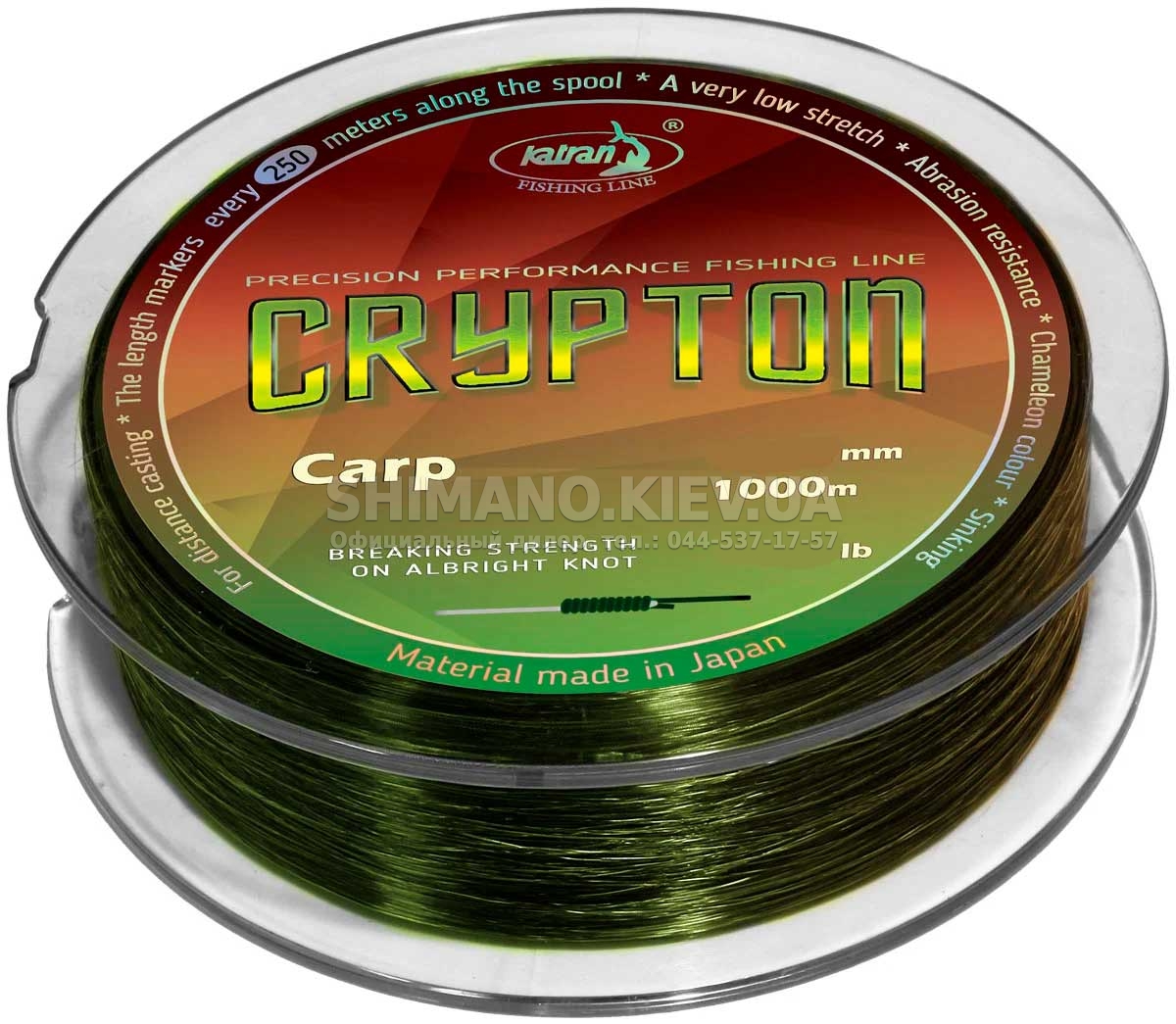 Жилка Katran Crypton Carp – продукт найвищого рівня. Співвідношення розривної міцності до діаметру – найкраще у лінійці Катран. Застосовано інноваційну технологію відбиття світла, яка маскує волосінь на будь-якому дні. На повітрі вона майже прозора, а у воді змінюється залежно від кольору дна. Жилки майже не видно на дні, щоб не відлякувати обережну рибу. Висока міцність вузла, низький коефіцієнт розтягування 13-14% та мала пам'ять - ще беззаперечно цінні переваги Crypton Сarp. Волосінь має високу стійкість до стирання, гладка, еластична, легко проходить крізь кільця вудилища. Призначена для лову на далеких дистанціях. Гладка поверхня захищає її від пилу та бруду, тому вона зберігає початкові властивості протягом тривалого часу. У розмотуванні є спеціальні позначки через кожні 250 м для точнішого розподілу запасу мотка на кілька котушок. Жилка упакована в залізні банки, які чудово захищають її від ультрафіолету та механічних пошкоджень при транспортуванні.- надвисока міцність вузла;
