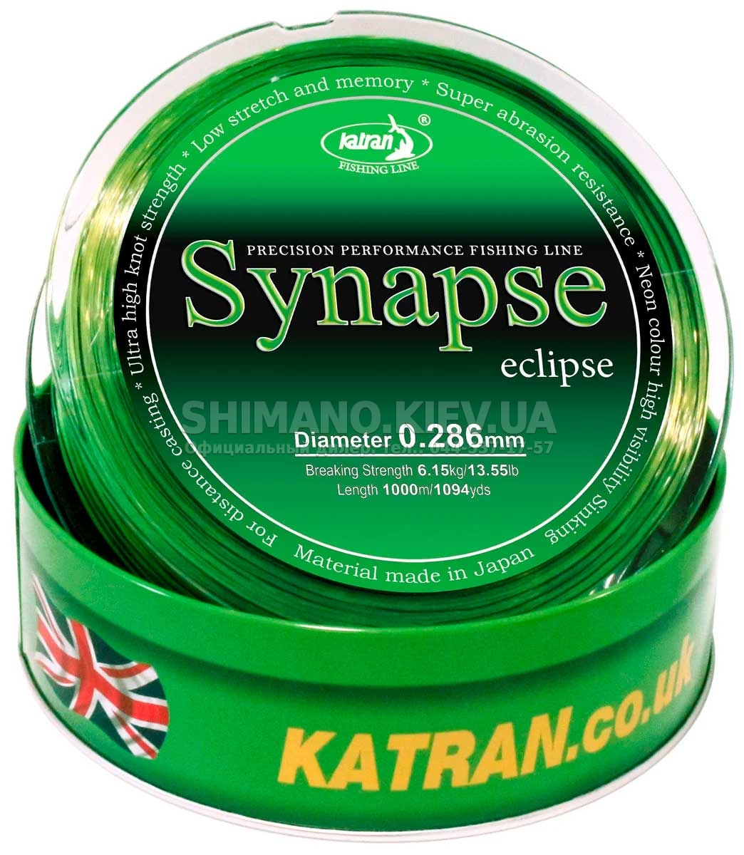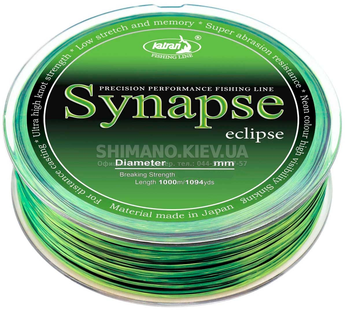 Волосінь Katran Synapse Eclipse Line розроблялася для лову коропа протягом всієї доби.Виробник поставив собі завдання створити універсальну флуоресцентну сополімерну тонку жилку. Особливі світло відбивні пігменти дозволяють зручно контролювати її у штучному освітленні. У виробництві застосовується та ж технологія, що й для виробництва Synapse Neon, завдяки чому було досягнуто абсолютно нового рівня інновацій. Забарвлення волосіні виконане чергуванням 2-х метрових відрізків неонового кольору відрізками чорного кольору довжиною 0.5 м. Завдяки цьому вона добре маскується на різних типах дна. Волосінь Katran Synapse Eclipse Line також ефективна в сонячні дні, ідеальна для використання в чистій воді, коли дуже важливо, щоб снасть була якнайменш помітною для риби.