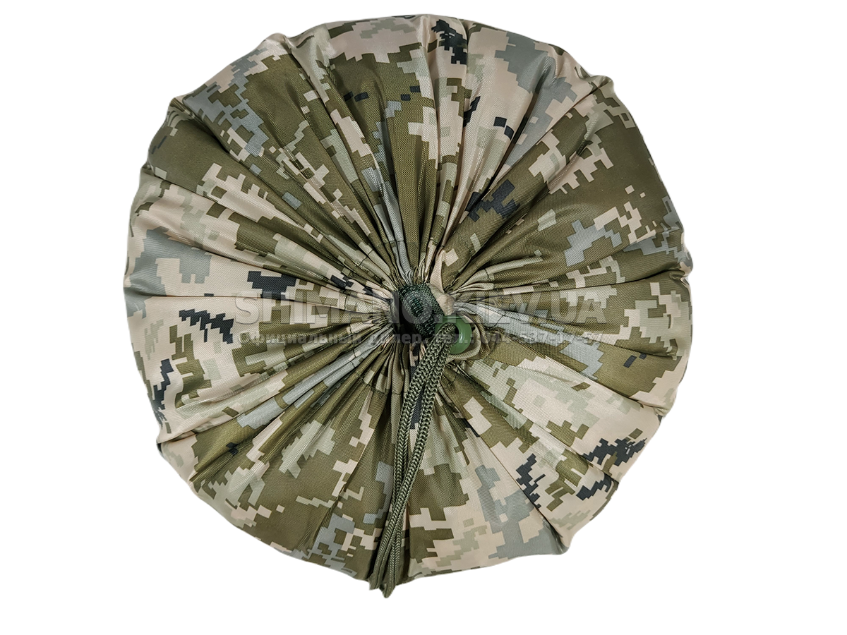 Мішок спальний тактичний військовий водонепроникний камуфльованого (піксельного) забарвлення – комфортний в експлуатації, надійний, теплий у будь-яких польових умовах, особливо в холодну пору року. Відмінні зігрівальні властивості. М’який наповнювач. Вшитий каптур затягується утяжкою. Застібається двосторонньою блискавкою. Блискавка вздовж утепленого коміра. У розкладеному вигляді можна використовувати як ковдру.